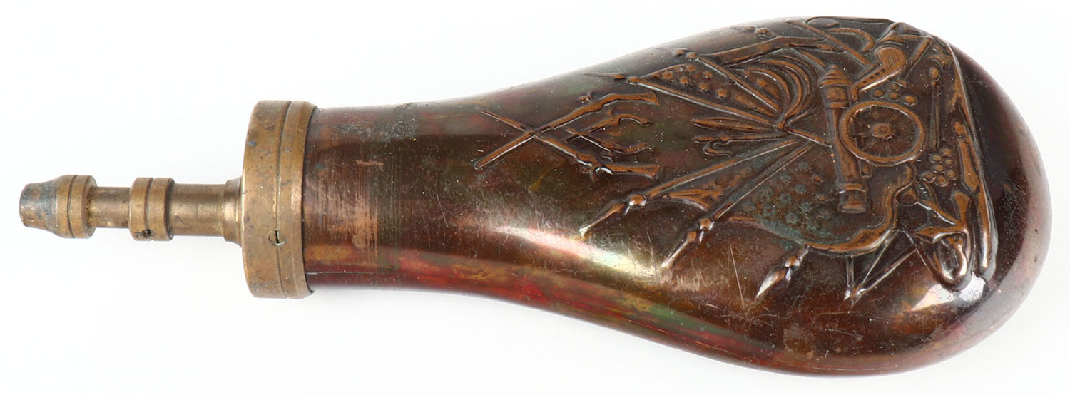 Brass powder flask, has some age soiling. Grade: Excellent - Value: 20 to 60