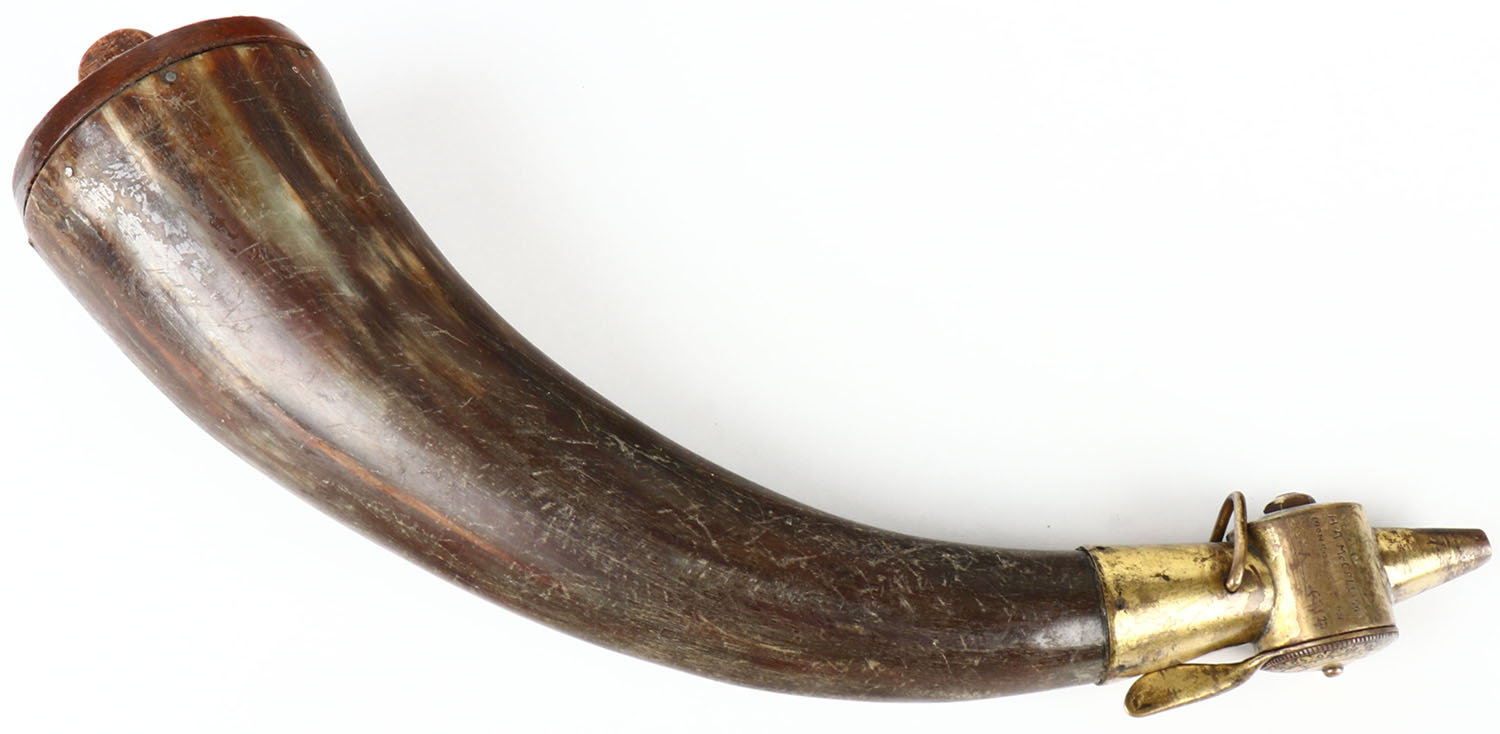 Harold A. McCallum(1911-2003 who is a famous collector of Winchesters an a muzzleloaer shooter from Monroe, ORE.), powder horn, with a brass tip identical to the Burnham flasks, crack to horn . Grade: Very Good + - Value: 50 to 250