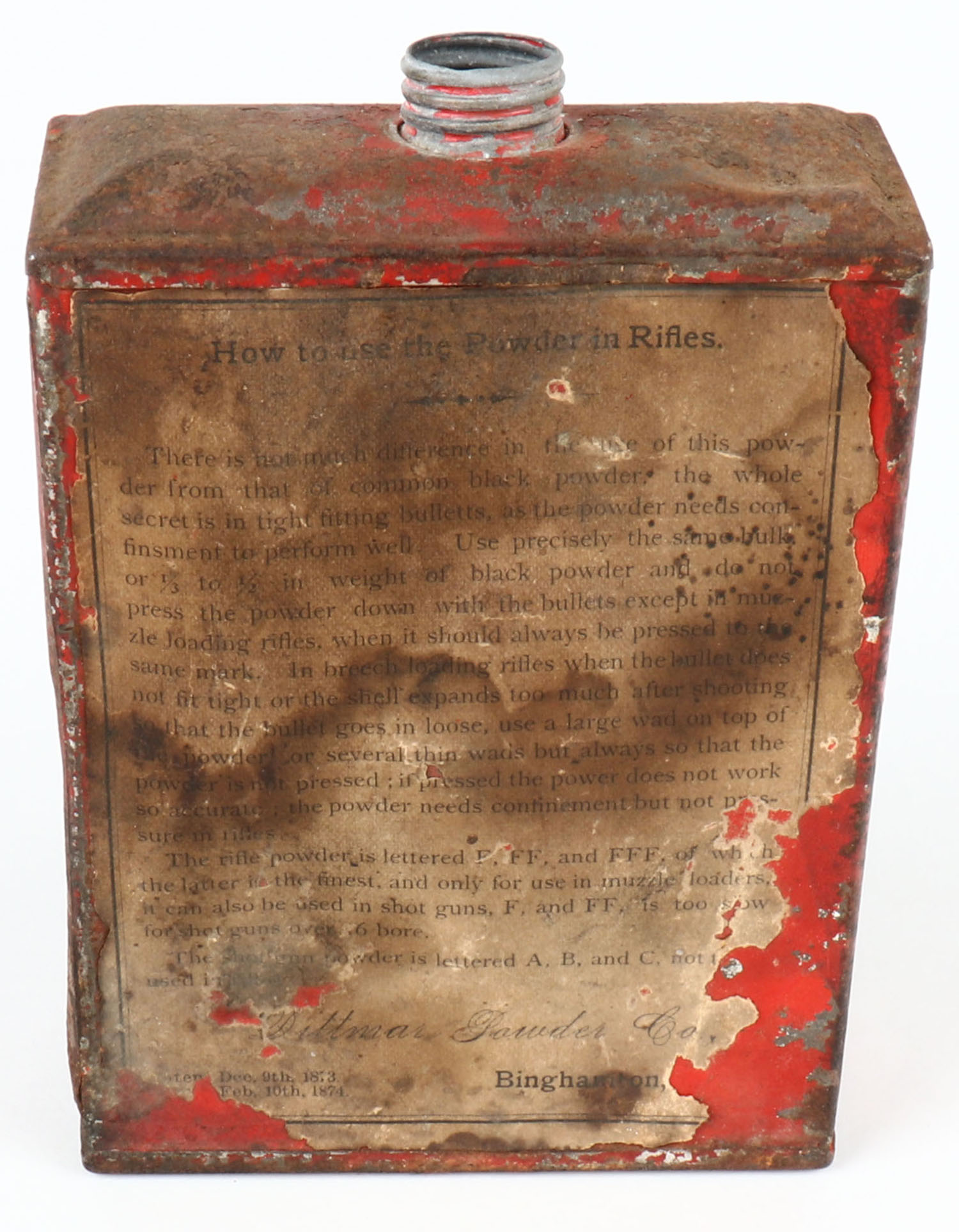 Antique powder tin, no cap, Ditmars new Sporting Powder, circa 1880s, has age soiling and damage to label. Grade: Very Good - Value: 20 to 60