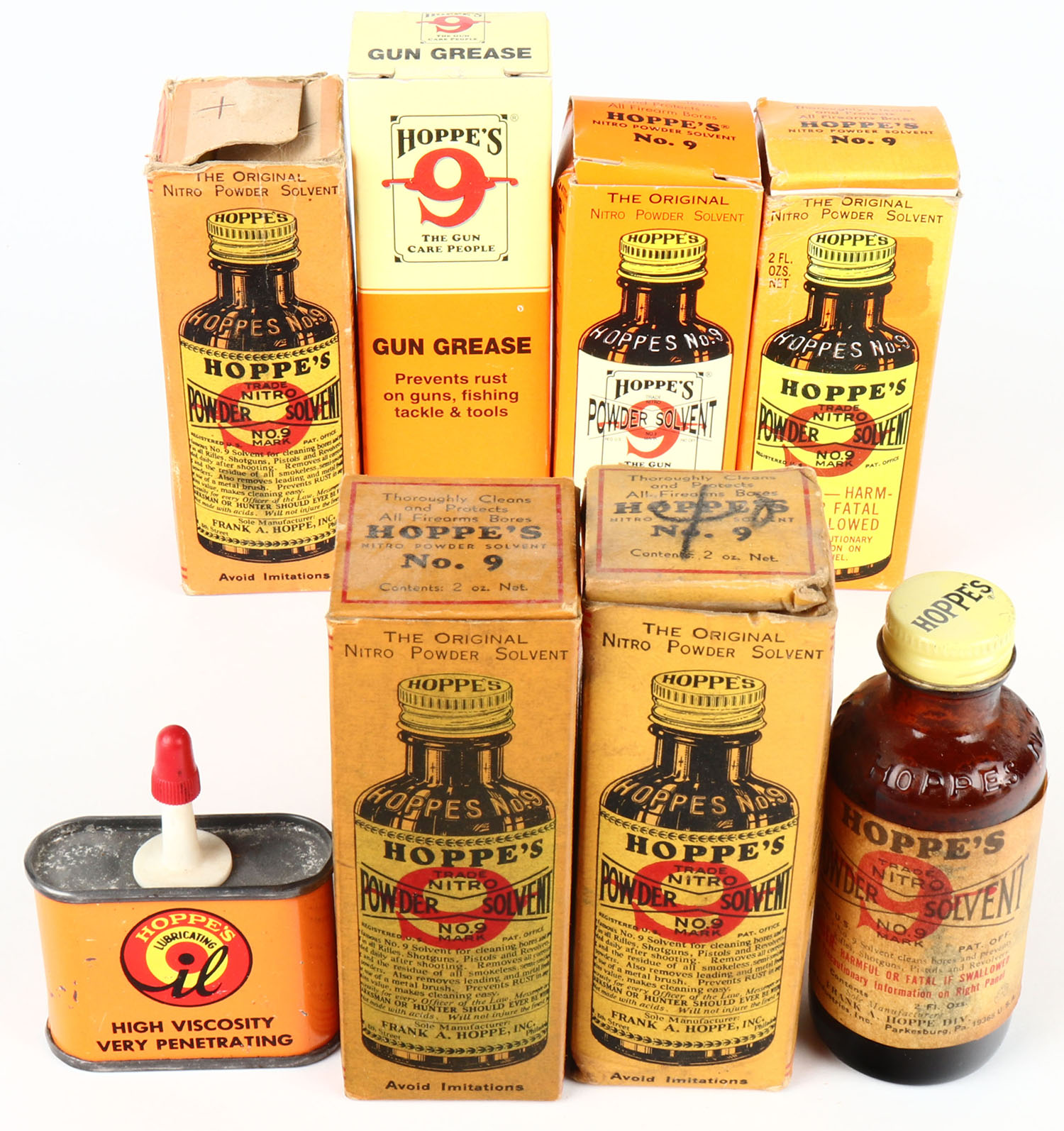 Lot of Hoppes oil tins, all Full or nearly Full. Grade: Very Good ++ - Value: 20 to 100