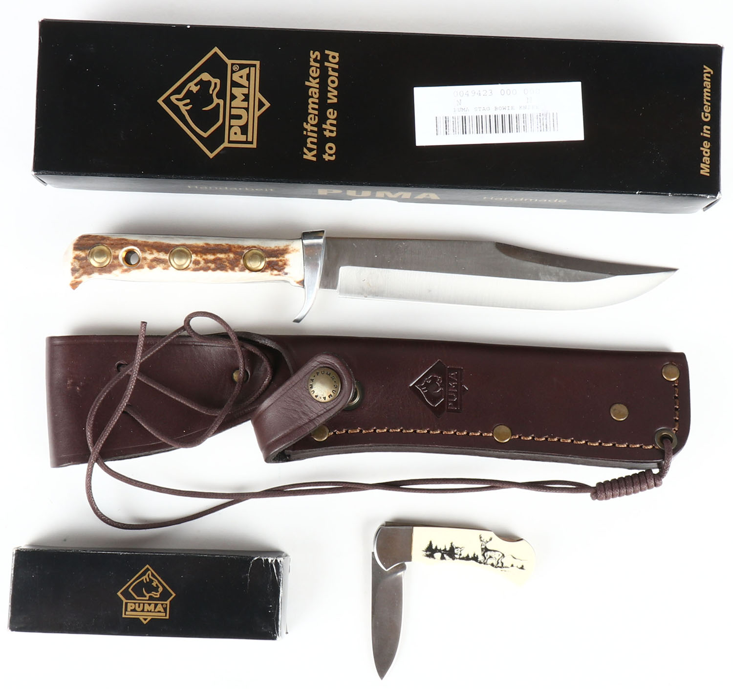 Lot of 2 PUMA knives, all in orignal boxes, 1 large fixed blade knife and 1 small folding knife. Grade: Excellent ++ - Value: 100 to 300