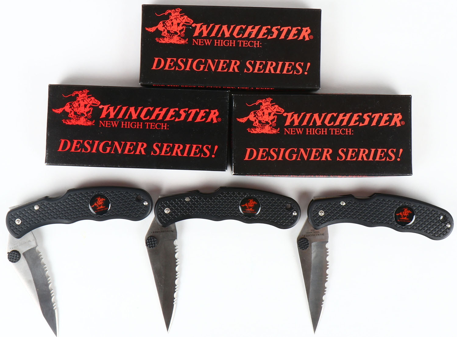 Lot of 3 Winchester folding knife, designer series, in box, 4 3/4 '' blade. Grade: Excellent ++ - Value: 20 to 80