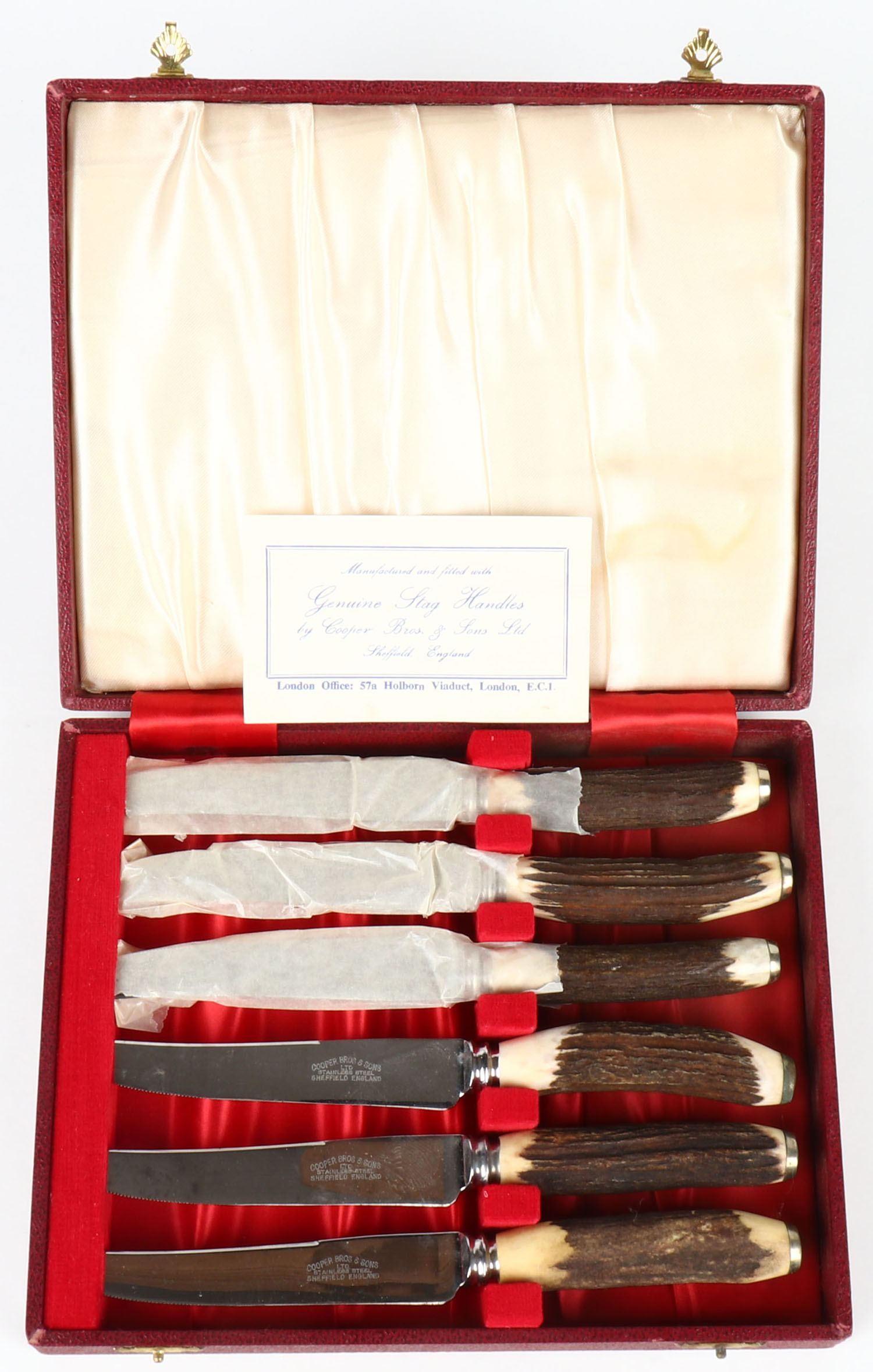 Cooper Bros & Sons LTD Sheffield England 6 steak knife set with geniue stag handles, in leather case. Grade: Excellent + - Value: 50 to 100