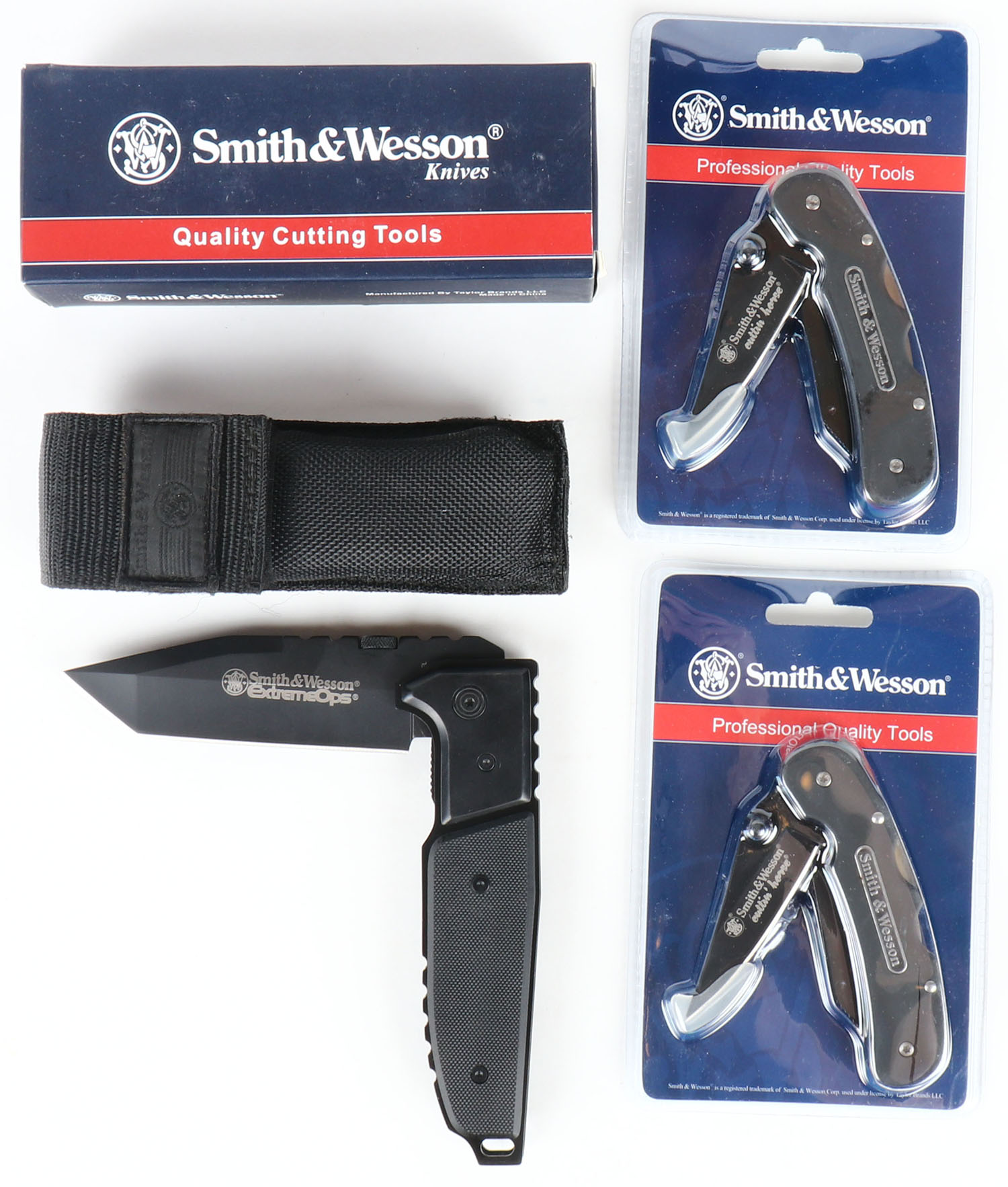 Lot of 3 S&W folding knives, in boxes. Grade: Excellent ++ - Value: 50 to 100