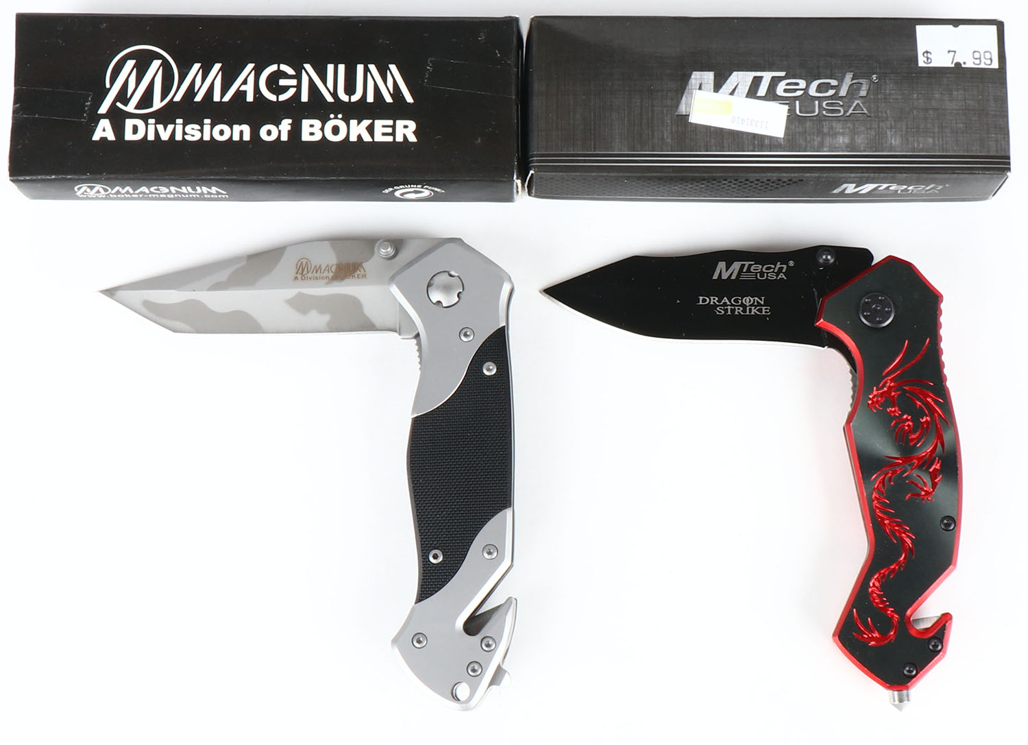 Lot of 2 folding knives, Boker Magnum and Mtech, in box. Grade: Excellent ++ - Value: 20 to 60