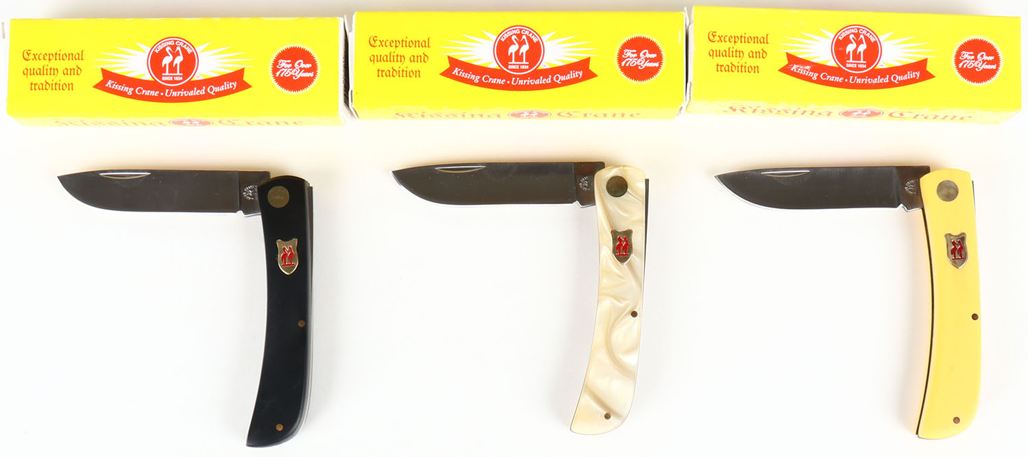 Lot of 3 Kising Crane folding knives, in box. Grade: Excellent ++ - Value: 16 to 50