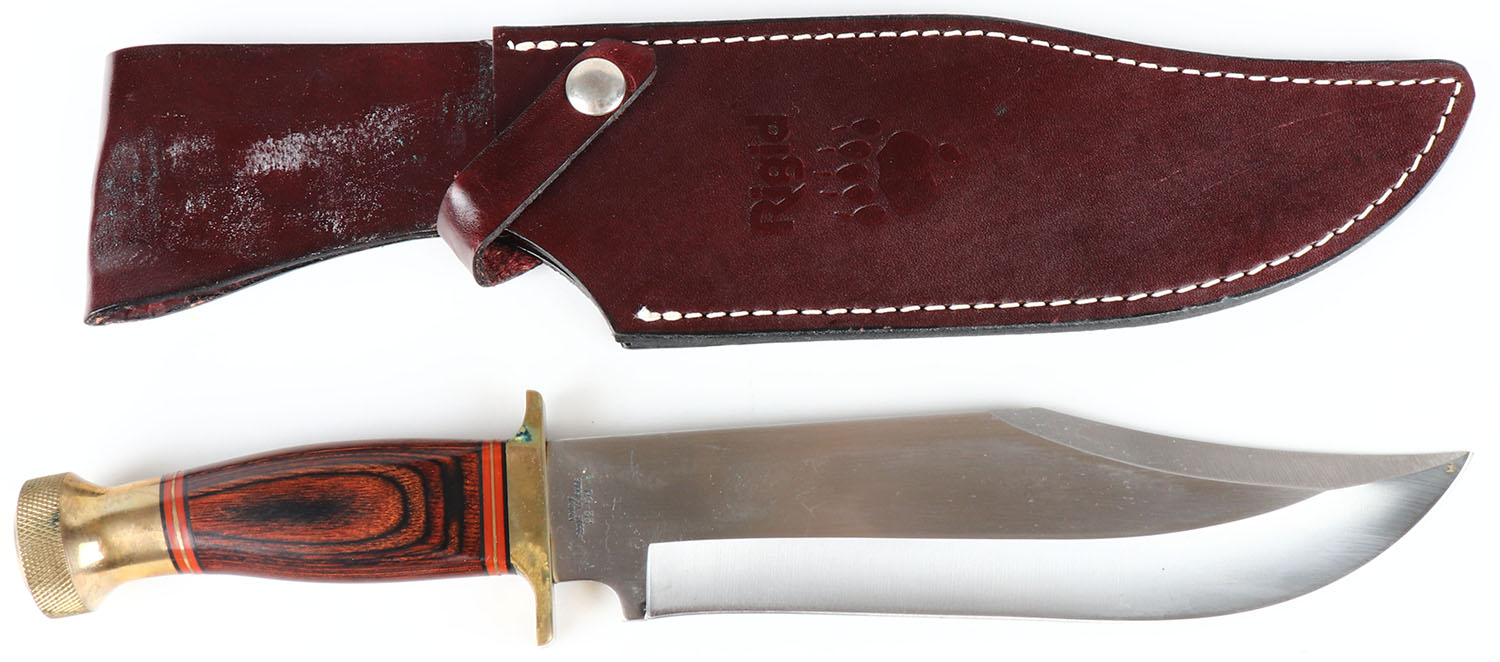 Large fixed blade knife, Ridgid made knife, has leather sheath, 9'' blade. Grade: Excellent - Value: 30 to 80