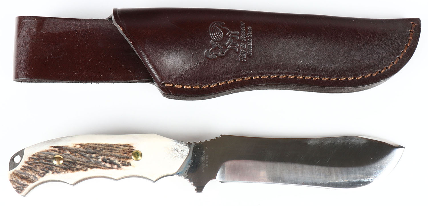 Fixed blade knife, Hen & Rooster knife, has leather sheath, 5'' blade. Grade: Excellent - Value: 20 to 60