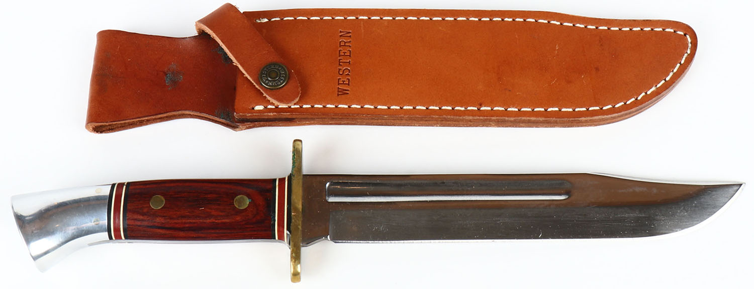 Fixed blade knife, Western knife, has leather sheath, 7 1/2'' blade. Grade: Excellent - Value: 30 to 90