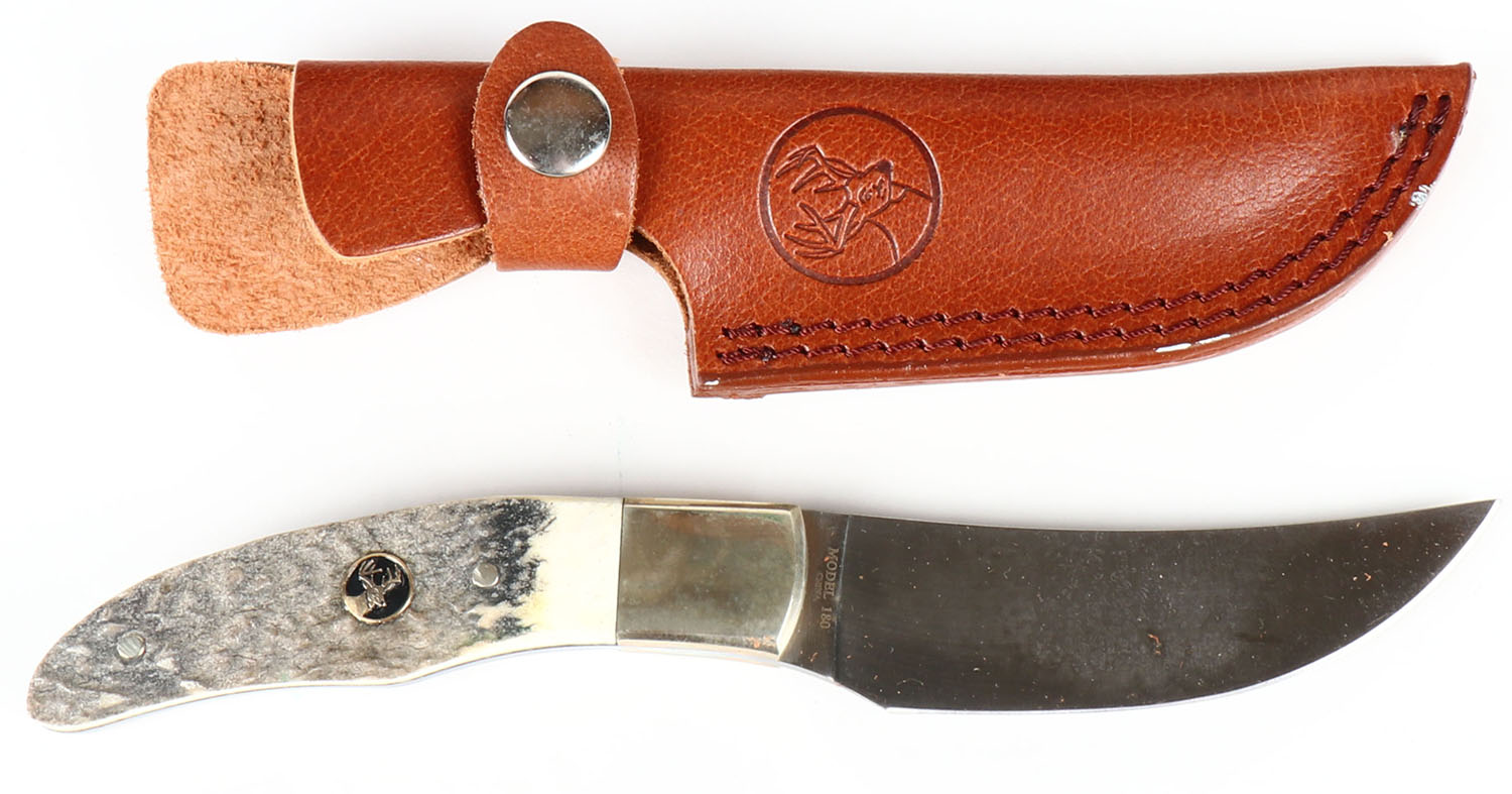 Fixed blade knife, Browning Deer Creek knife, model 180, has leather sheath, 4'' blade. Grade: Excellent - Value: 30 to 90