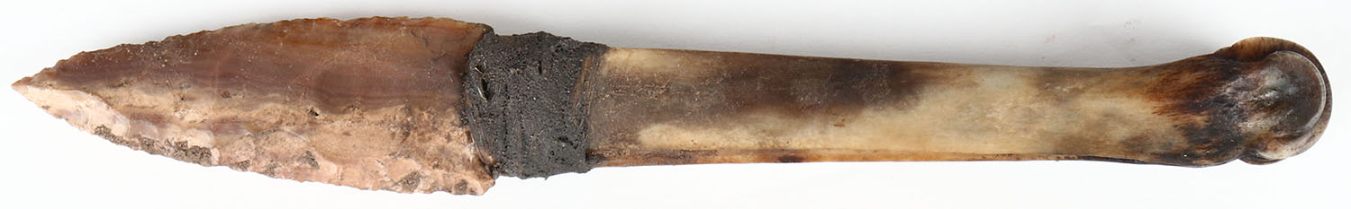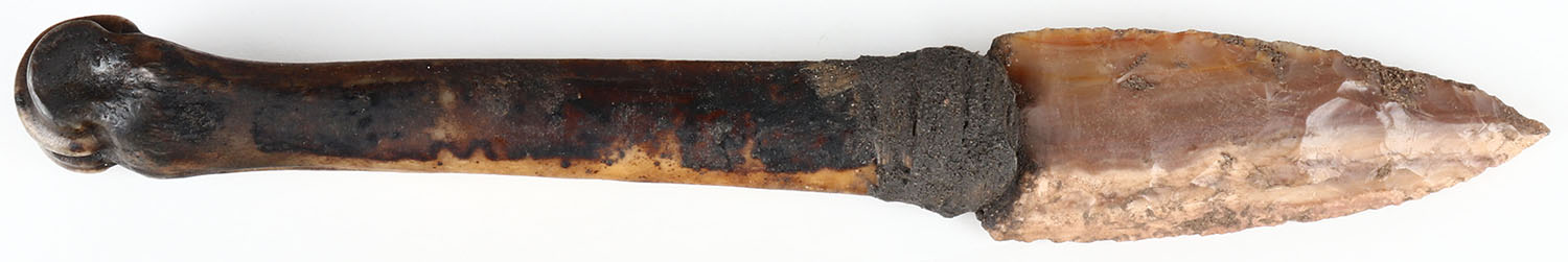 Extremely RARE, Prehistoric Mississippian Inidian Culture, 9 1/2'' OAL bone handle flint blade knife wrapped in sinew with what looks to be Buffalo dung and pine tar glue mixture, Museum grade, flint blade. Grade: Very Good - Value: 50 to 700