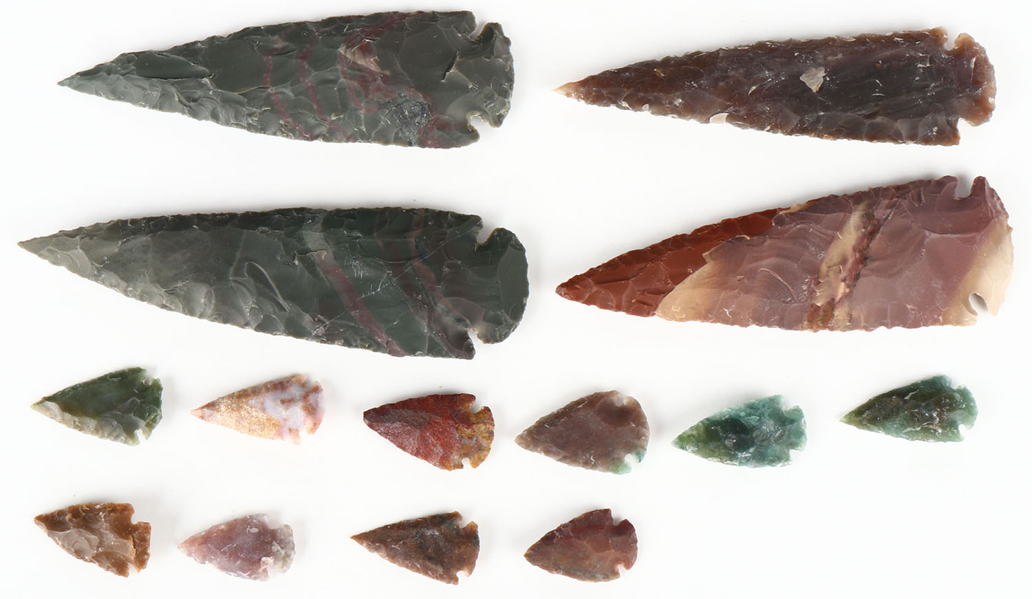 Lot of 4 large flint spear tips and a grouo os small arrow heads. Grade; Excellent - Value: 50 to 200