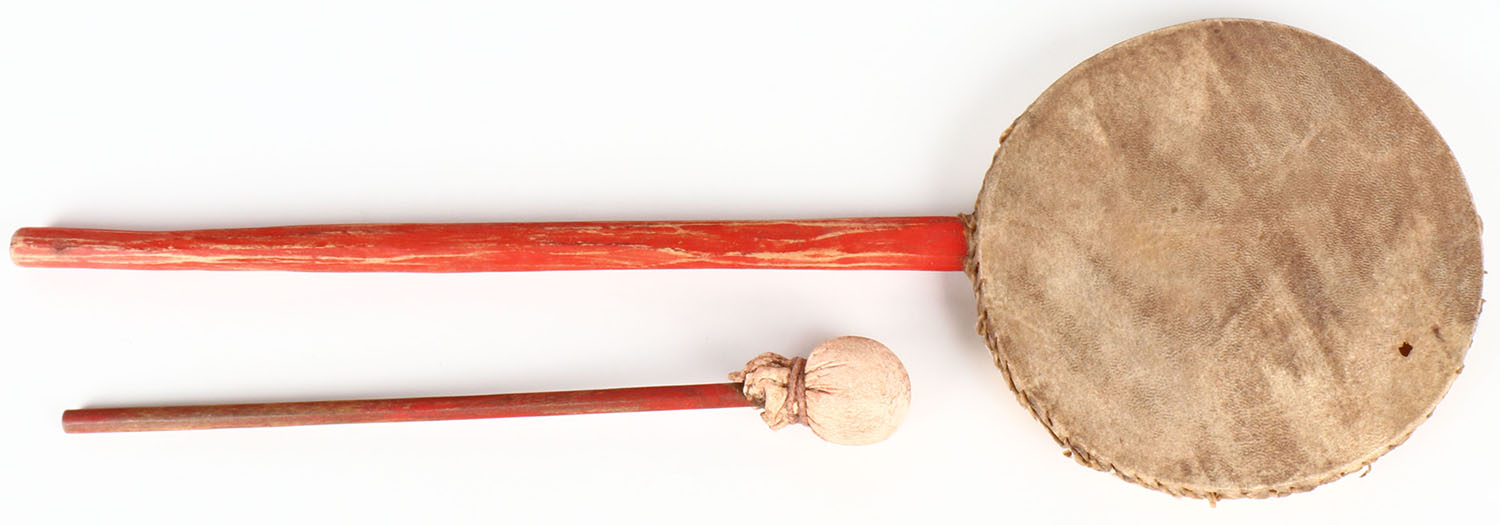 One of a kind Blackfoot Native Ameircan Medicne man held prayer drum with orignal beater, rawhide head nd lcaing with red ocher paint on handle circa 1890. Grade: Excellent - Value: 20 to 500