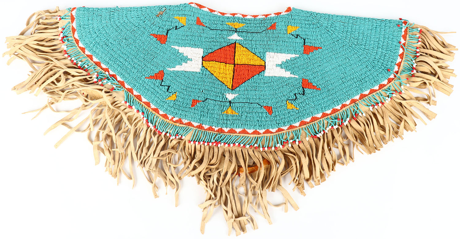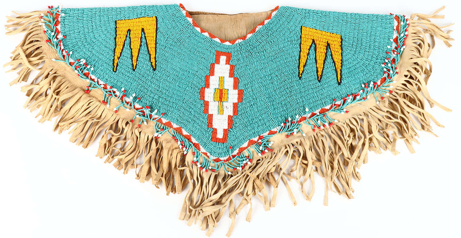 Osage Native american fully beaded womesn shoulder Yoke, circa 1890-1910 from Chilocco Indian School in Oklahoma, This artifcat from early Osage reservation period was obtained at the school when it closed down 40+ years ago after the school had been going for 100+ years, Fully beaded on brain tan buckskin lined with trade cloth and has fringe all the way around, very heavy and near perfect. Grade: Excellent - Value: 400 to 900