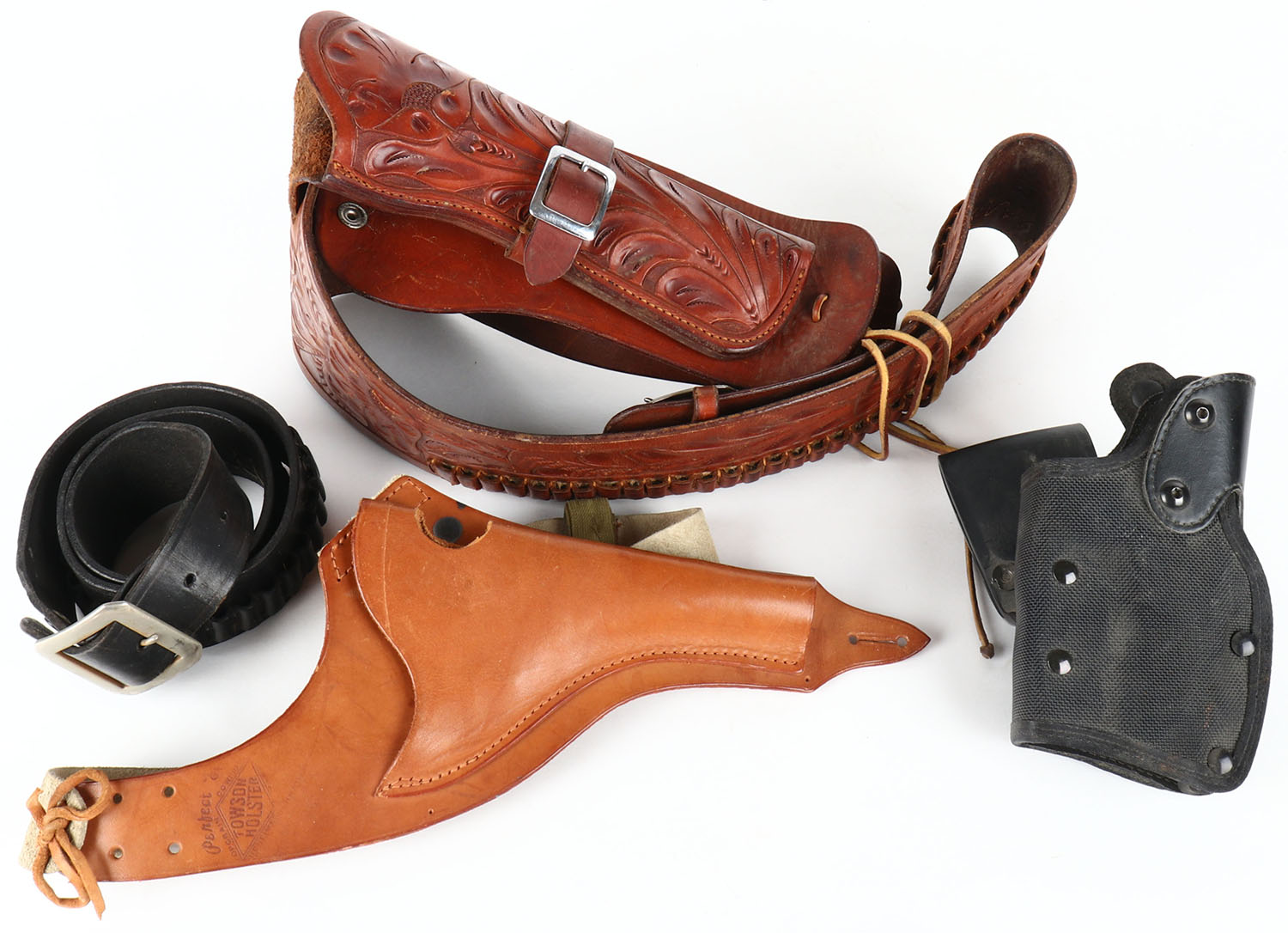 Lot of leather holsers and belts. Grade: Excellent - Value: 30 to 90
