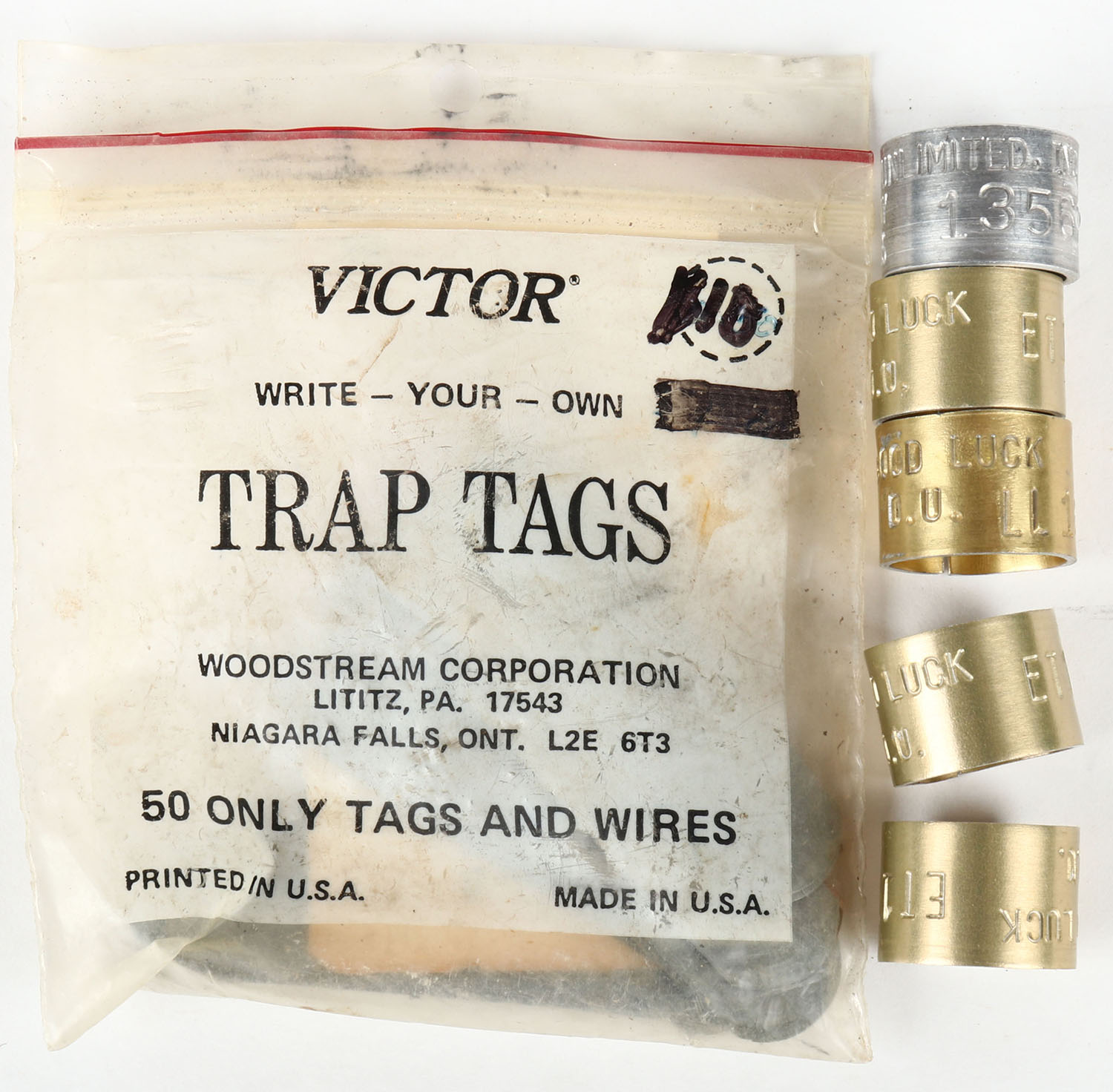 Lot of various animal tags, Victor trap tags and DU duck bands. Grade: Excellent - Value: 10 to 60