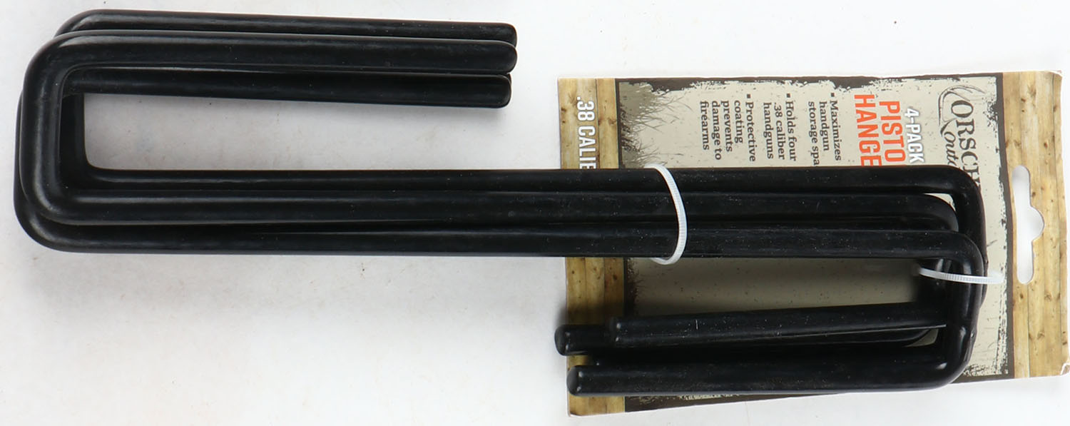 Orscheln 4 pack pistol hanger, .38 cal. these hook onto your shelf in your gun safe or book shelf so you can hang your pistol on the lower rod by sliding your barrel over the protected rod, helps keep your pistols organized & adds room for storage. Grade: Excellent ++ - Value: 10 to 20
