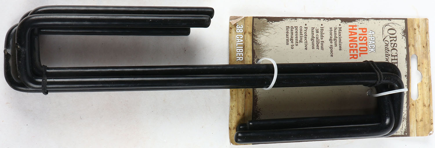 Orscheln 4 pack pistol hanger, .38 cal, or larger. these hook onto your shelf in your gun safe or book shelf so you can hang your pistol on the lower rod by sliding your barrel over the protected rod, helps keep your pistols organized & adds room for storage. Grade: Excellent ++ - Value: 10 to 20