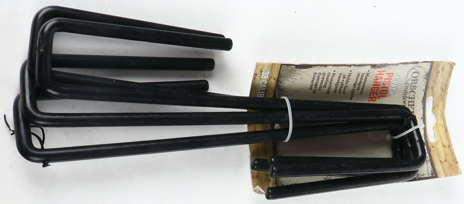 Orscheln 4 pack pistol hanger, .38 cal, or larger. these hook onto your shelf in your gun safe or book shelf so you can hang your pistol on the lower rod by sliding your barrel over the protected rod, helps keep your pistols organized & adds room for storage. Grade: Excellent ++ - Value: 10 to 20