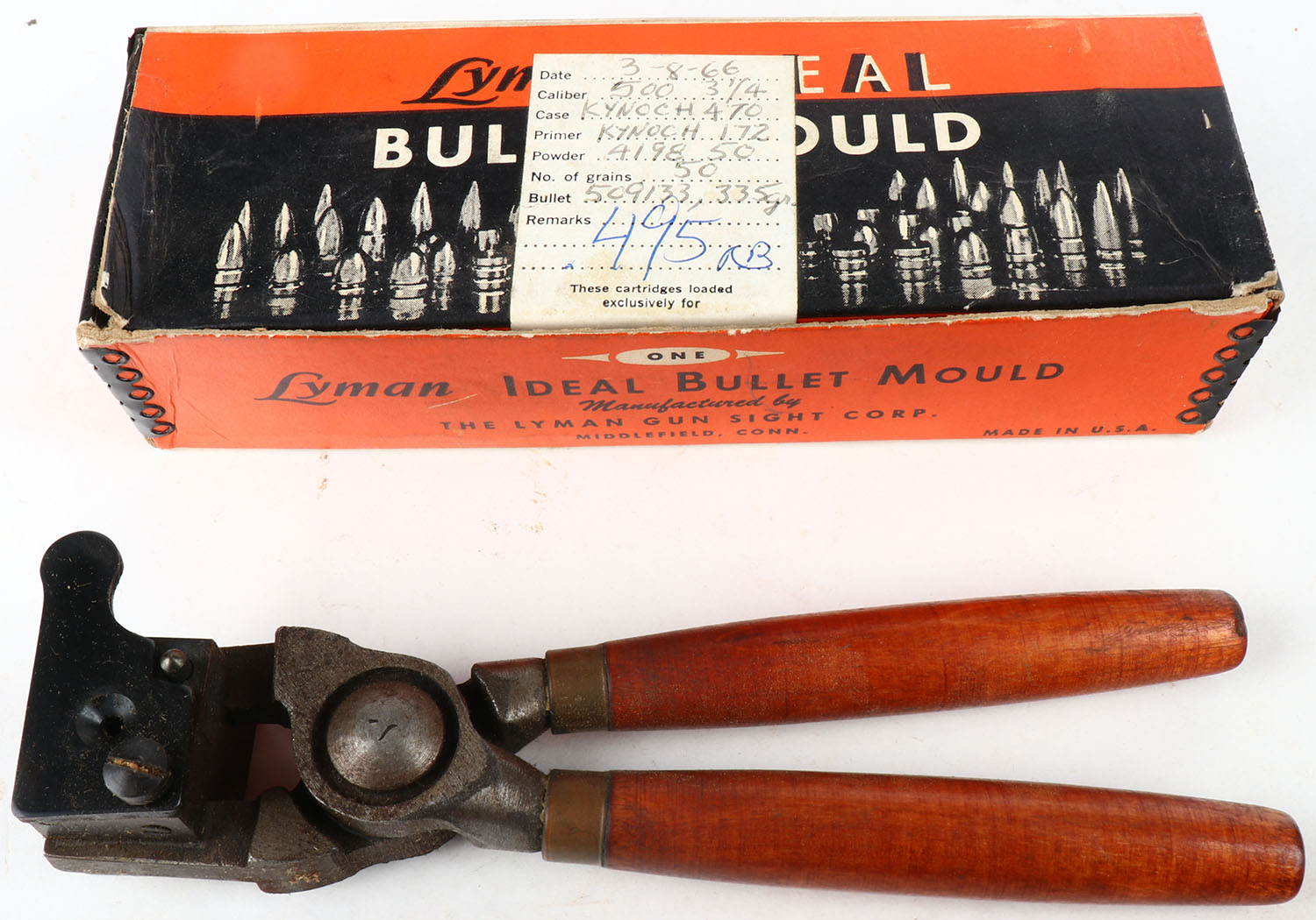 Lyman Ideal bullet mould reloading tool, in box, .495 cal single cavity round ball moulds. Grade: Excellent - Value: 40 to 80