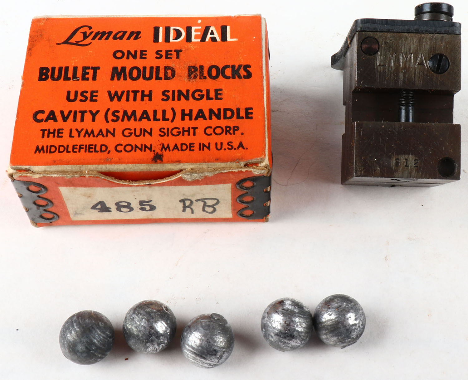 Lyman Ideal bullet mould block in orignal boxes, .485 cal round ball moulds. Grade: Excellent - Value: 16 to 50