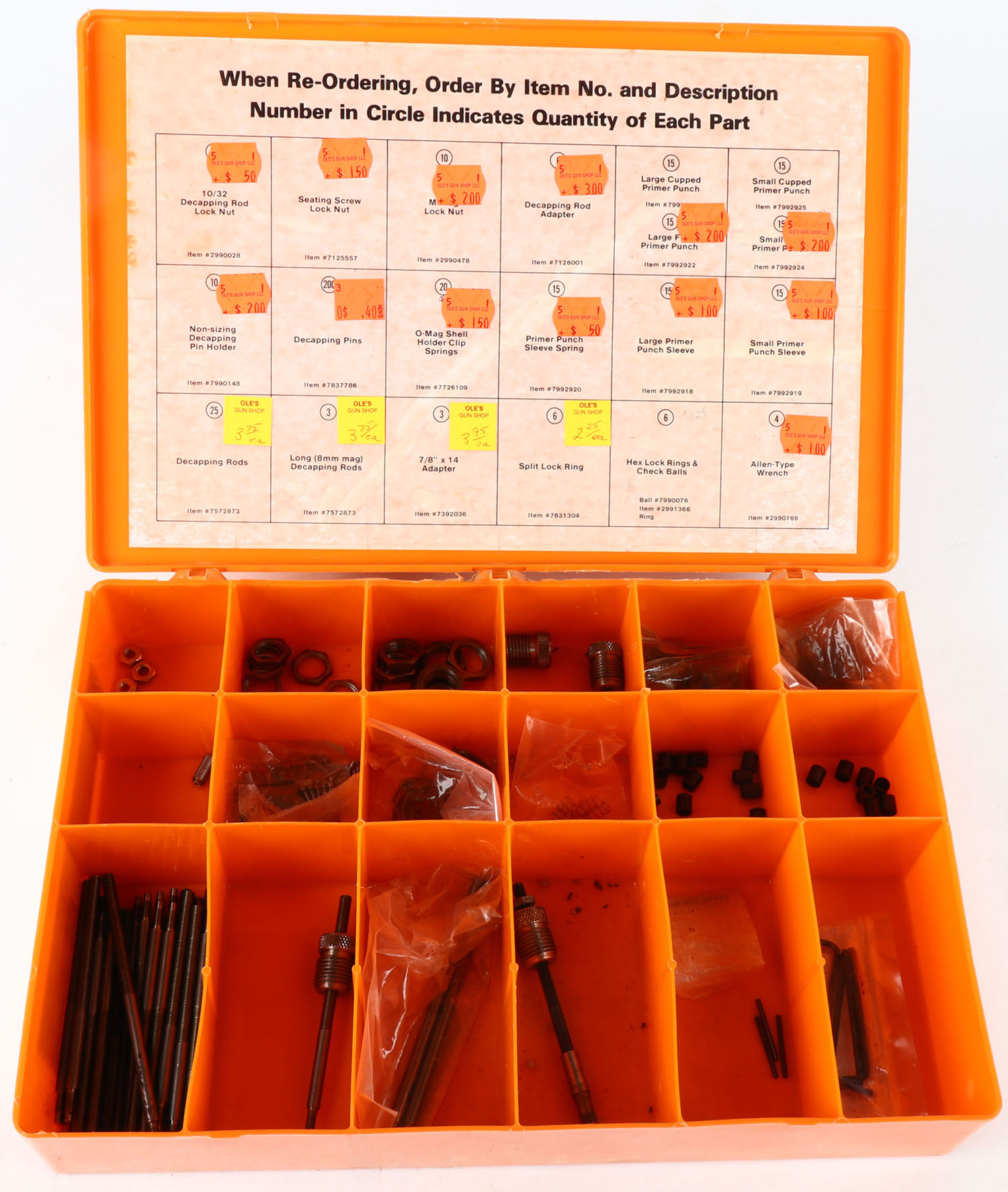 Lyman Reloading center, case of parts, all FULL, dye & press part kit. Grade: Excellent ++ - Value: 30 to 90