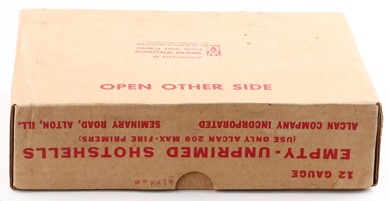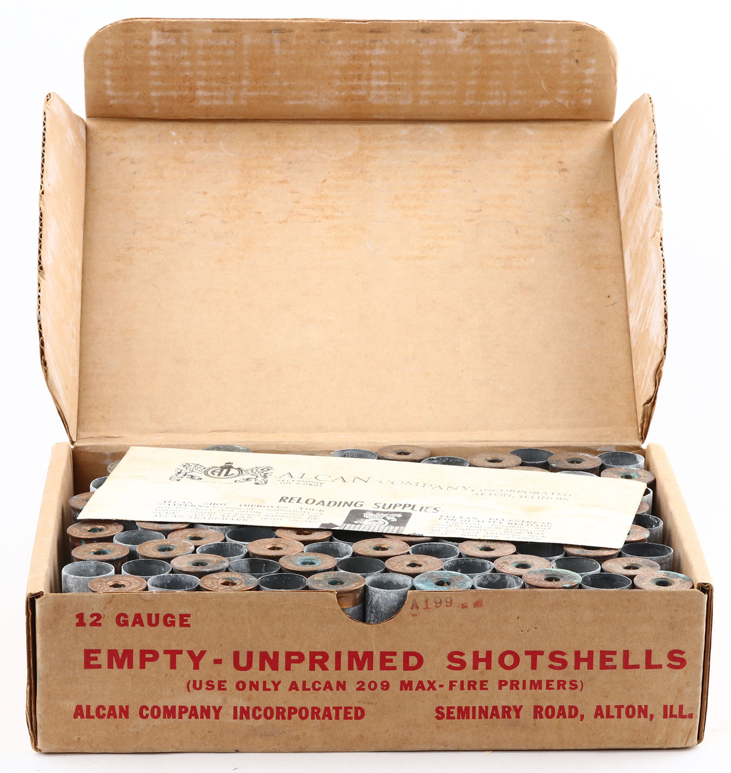 ALCAN 100ct. Box with Insert, 12ga., Empty Shotshells Unprimed, Possibly Fired, Full, buff box with red print, box is solid with writing to top, Shells are good. Grade: Excellent - Value: 30 to 100