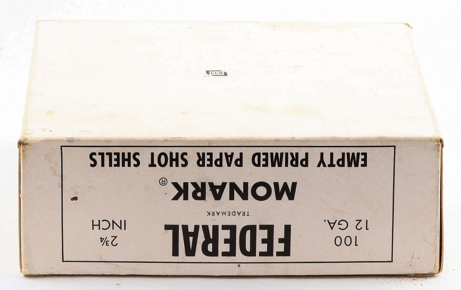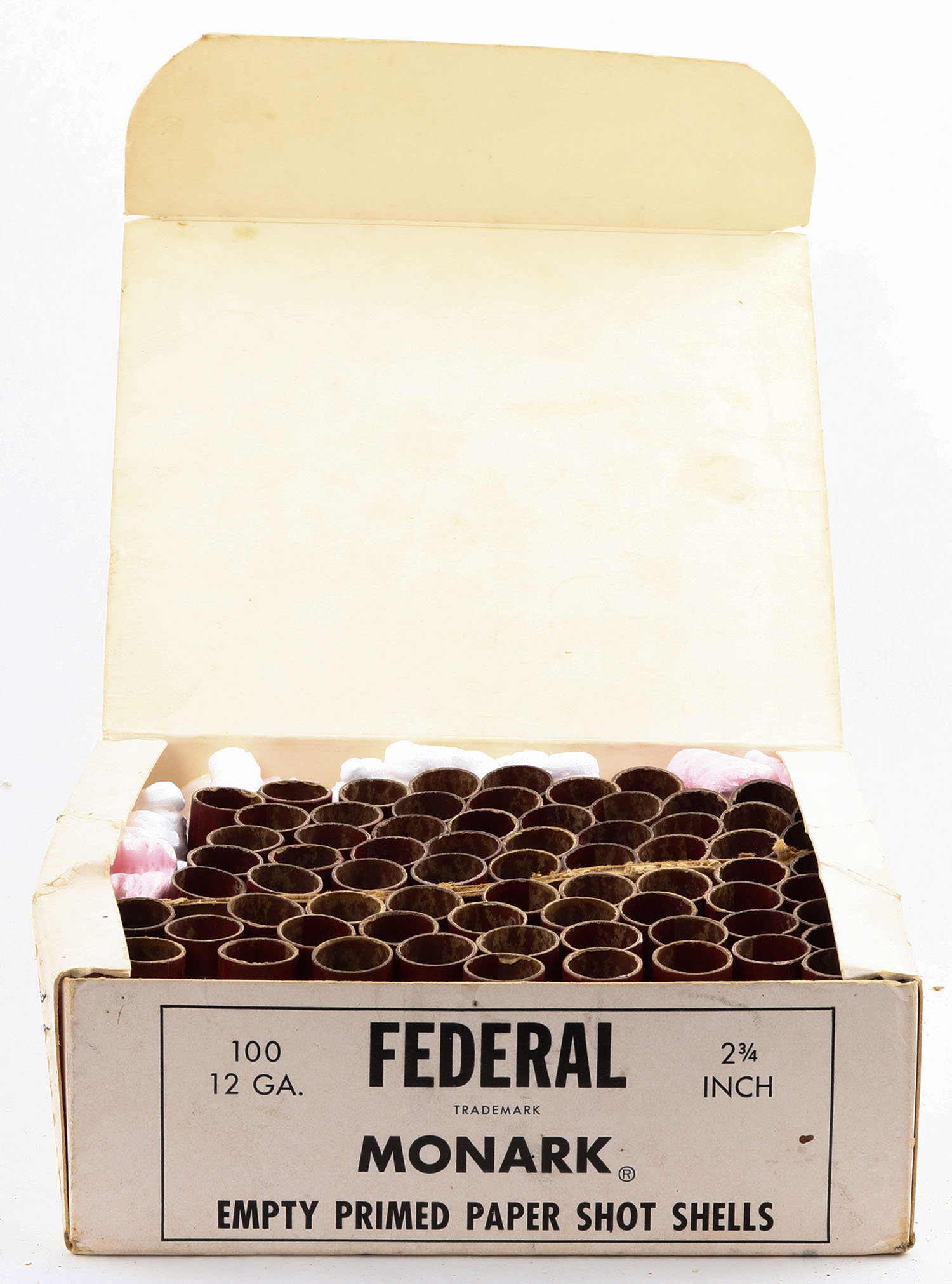 Federal, Monark, 12ga, 1pc., Partial 67rds of NPE, 2 3/4'', white box with black text, box has edge wear & light scuffing. Paper shells are excellent. Grade: Very Good ++ - Value: 40 to 200