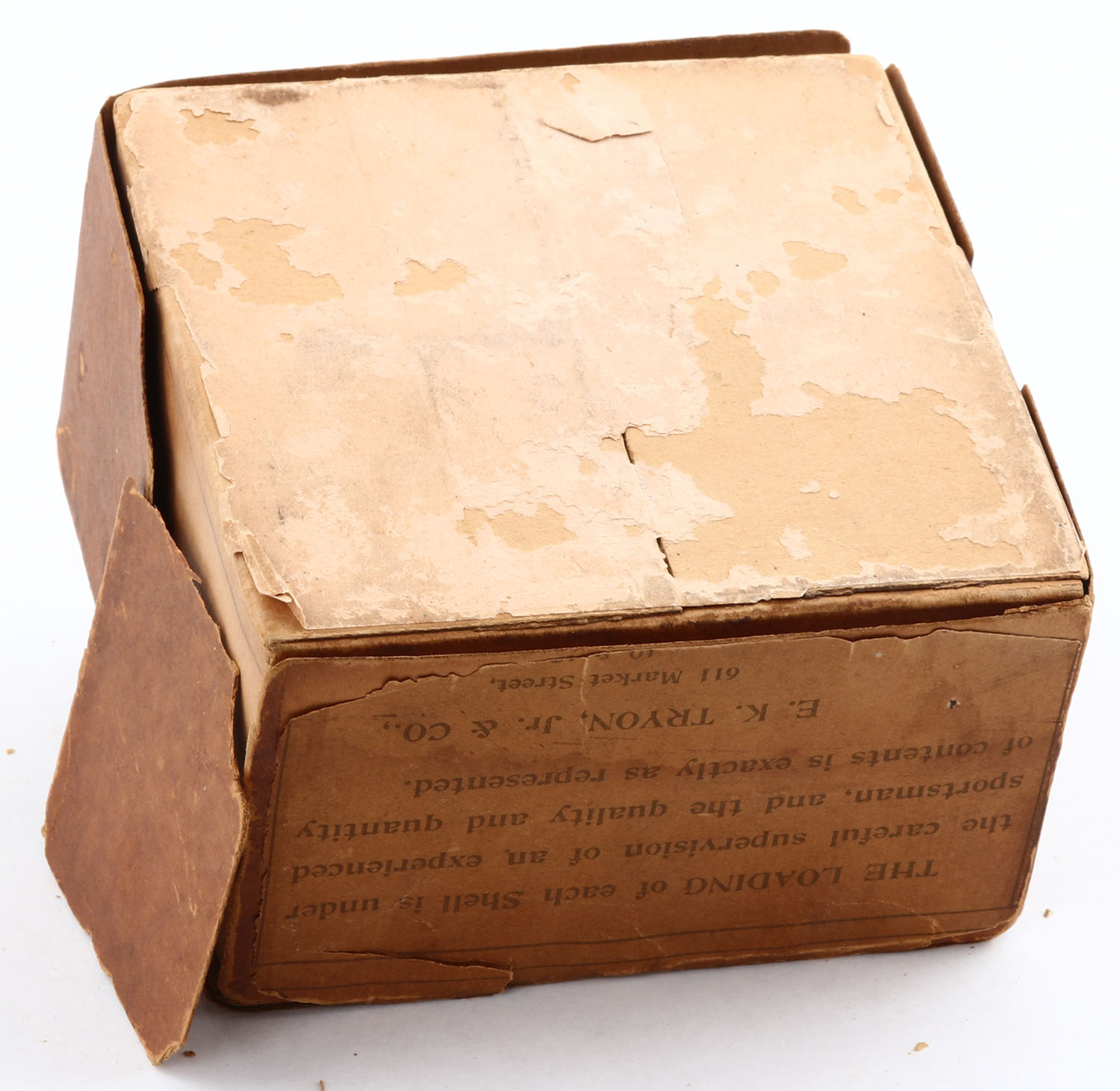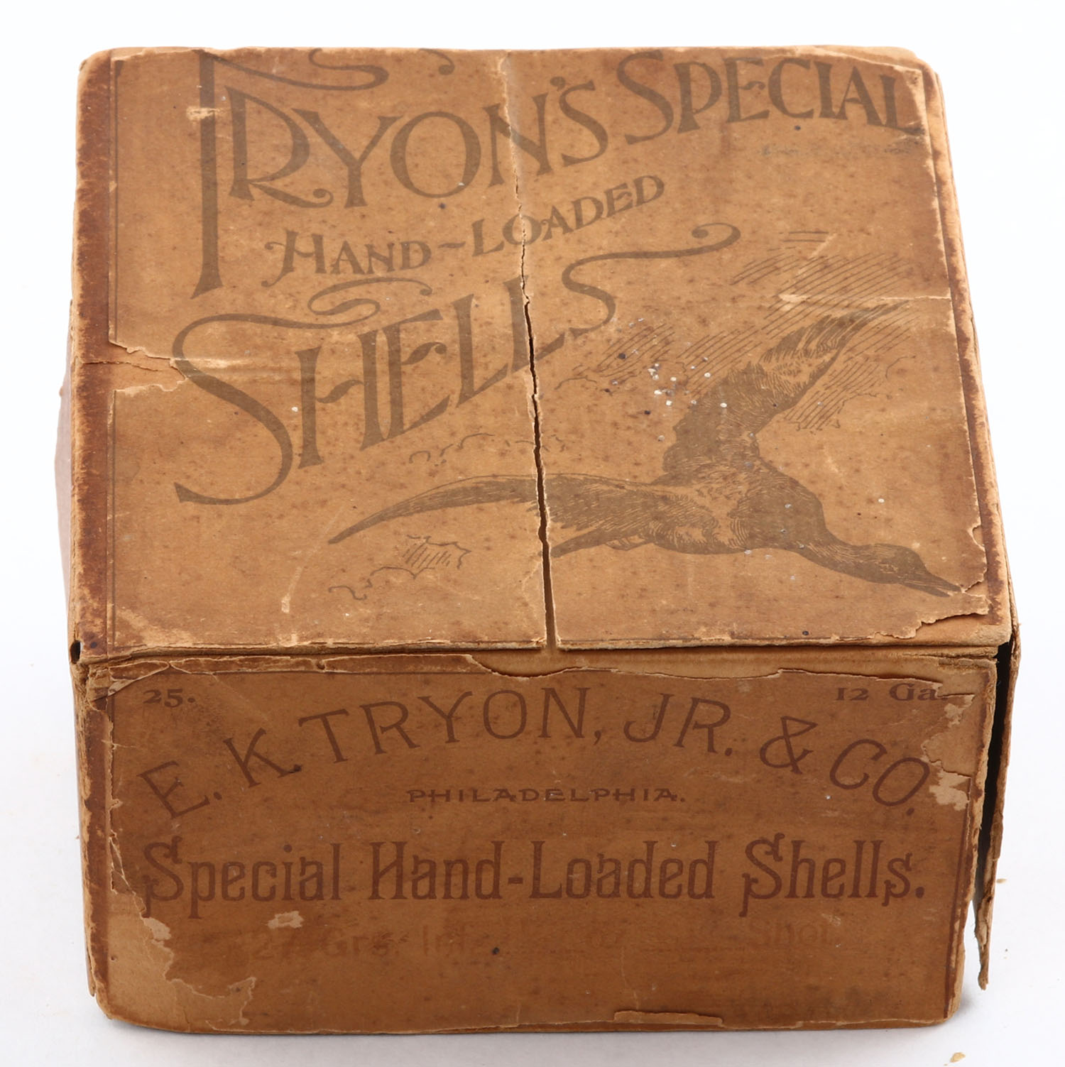 RARE E.K. Tyron Jr. & Co., Special Hand-Loaded Shells, 12ga., 2pc., Empty, shot size unknown, buff box with buff & red label, pictures duck flying, box has seam splits to top and to side with a partial tear to top, has a tear to left side flap, box has age soiling with edge wear & scuffing. Grade: Good - Value: 400 to 1200
