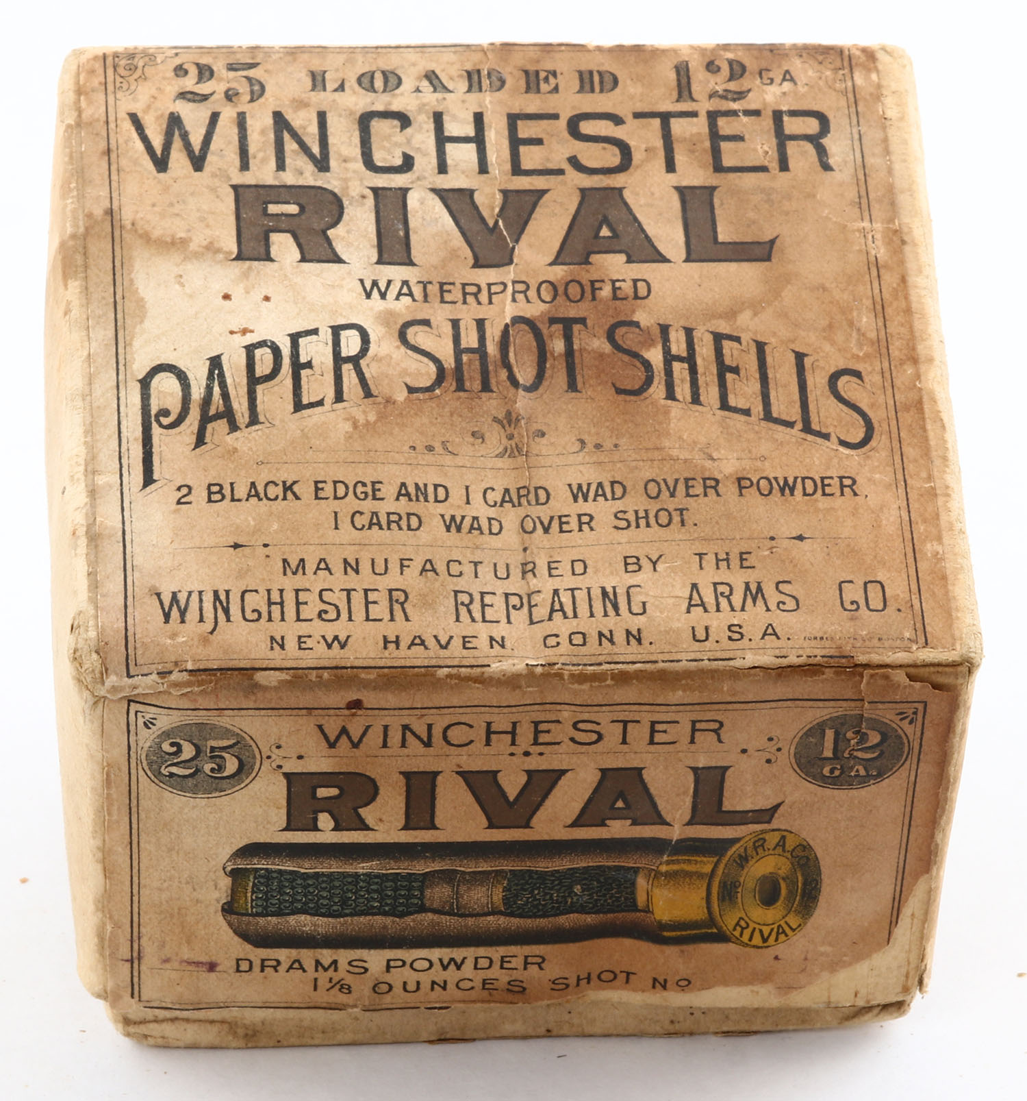 RARE!!! Winchester, RIVAL, 12ga., 2pc., Partial 24rds of fired paper shells, buff box with buff & brown label, has rare CUT-A-WAY shot shell on side, box has age soiling & scuffing with edge wear, has a tear to seam, label is 90% intact, paper shells are fair. HARD TO FIND BOX! Grade: Very Good - Value: 200 to 800