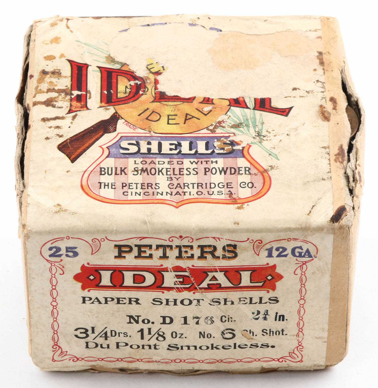 RARE Peters Cart., IDEAL SHELLS, 12ga., 2 3/4'', 2pc., Full with 24rds being correct shot, Loading: 3 1/4 Drs., 1 1/8 Oz., No. 6ch shot, buff box with multi colored label, box has seam splits with shell protrusion, has age soiling with tape repair to bottom, label is about 80% intact, paper shells are excellent. Grade: Very Good - Value: 150 to 800