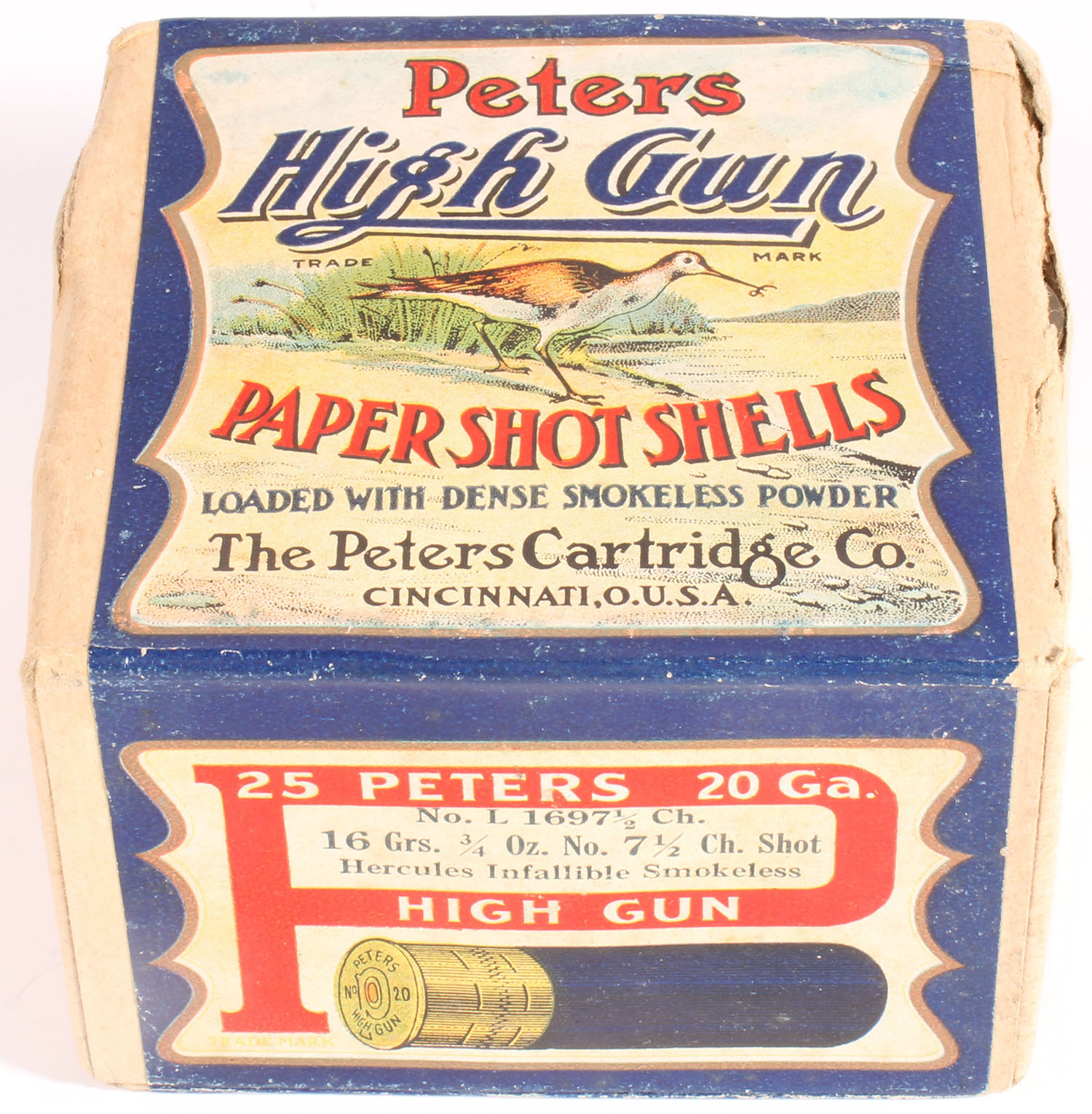 Peters Cart. Co., HIGH GUN , 20ga, 2pc., FULL & SEALED, shot size 7 1/2 Ch., buff box with multi colored picture of Snipe, Loading: No. L. 1697 1/2 Ch 16 Grs. 3/4Oz. 7 1/2CH Shot, Hercules Infallible Smokeless, box has edge wear with shell protrusion to top & bottom, The label is excellent, 100% original. RARE collectible box in this condition. Grade: Very Good ++ - Value: 1000 to 8000