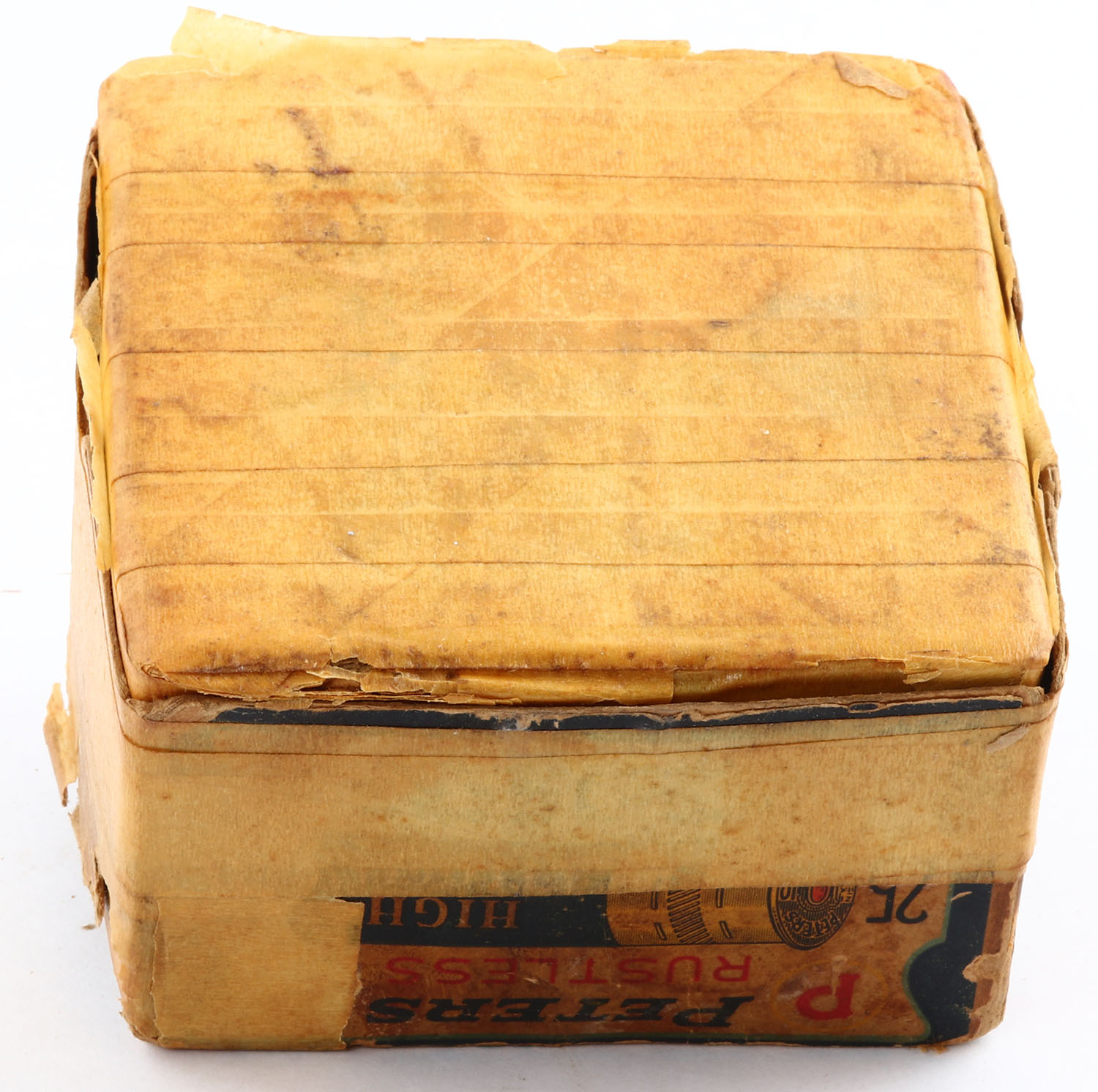 Peters Cart. Co., Blue Bill, 10Ga., 2pc., Partial 23rds with 13 being correct shot, shot size 6 CH shot, buff box with multi colored label that pictures Blue Bill in flight, box has tape to top & bottom, has soiling, tears & seam splits, paper shells are very good. Grade: Fair - Value: 40 to 100