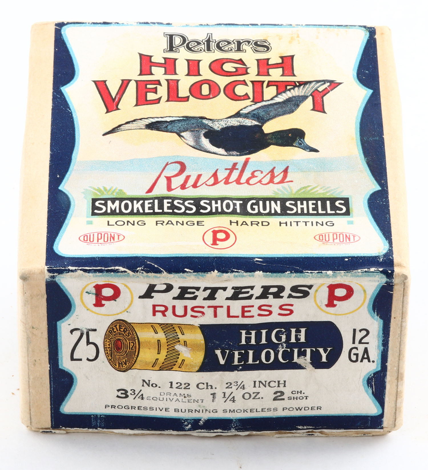 Peters Cart. Co., Blue Bill, 12ga., 2pc., FULL, shot size 2 CH, buff box with multi colored label that pictures Blue Bill in flight, box has light edge wear with some scuffing, paper shells are excellent. Grade: Excellent + - Value: 100 to 400