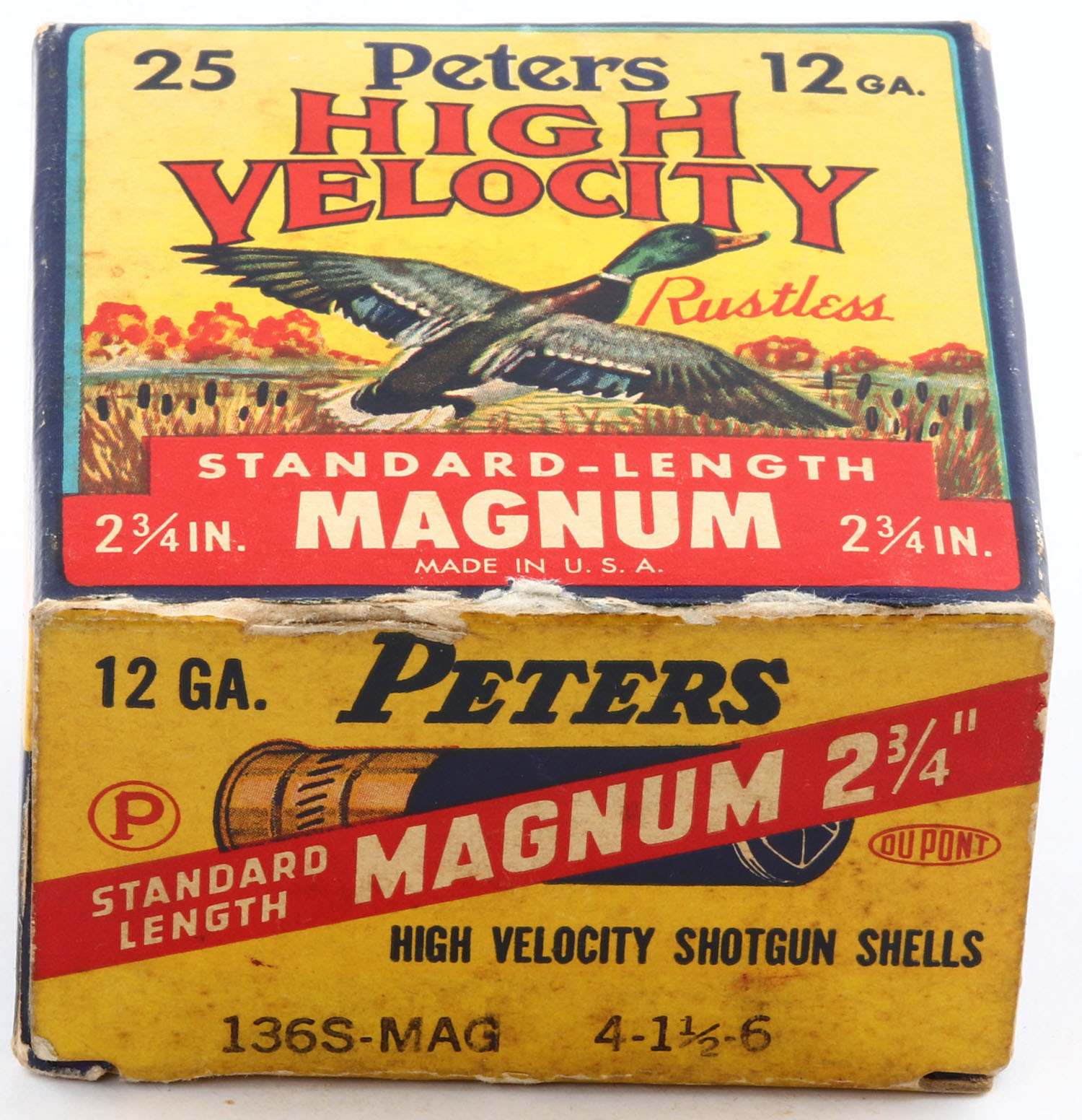 Peters Cart. Co., Standard-Length Magnum, High Velocity, New Peters Crimp, 12ga., 1pc., Full with 21rds being correct shot, shot size 6 Magnum, multi colored box that pictures mallard flying out of the marsh grass, box is solid with light edge wear & minor scuffing, paper shells are excellent. Grade: Excellent - Value: 60 to 140