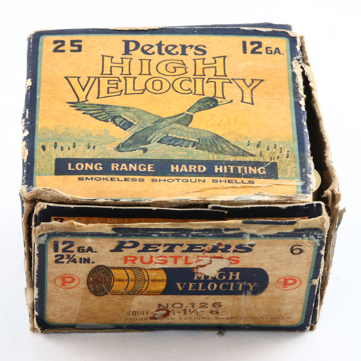Peters Cart. Co., Bridgeport, CT, High Velocity, 12ga., 2 3/4'', 1pc., Full, shot size 6, multi colored box that pictures mallard flying out of the marsh grass, box has age soiling with edge wear & seam splits, paper shells are excellent. Grade: Good ++ - Value: 40 to 100