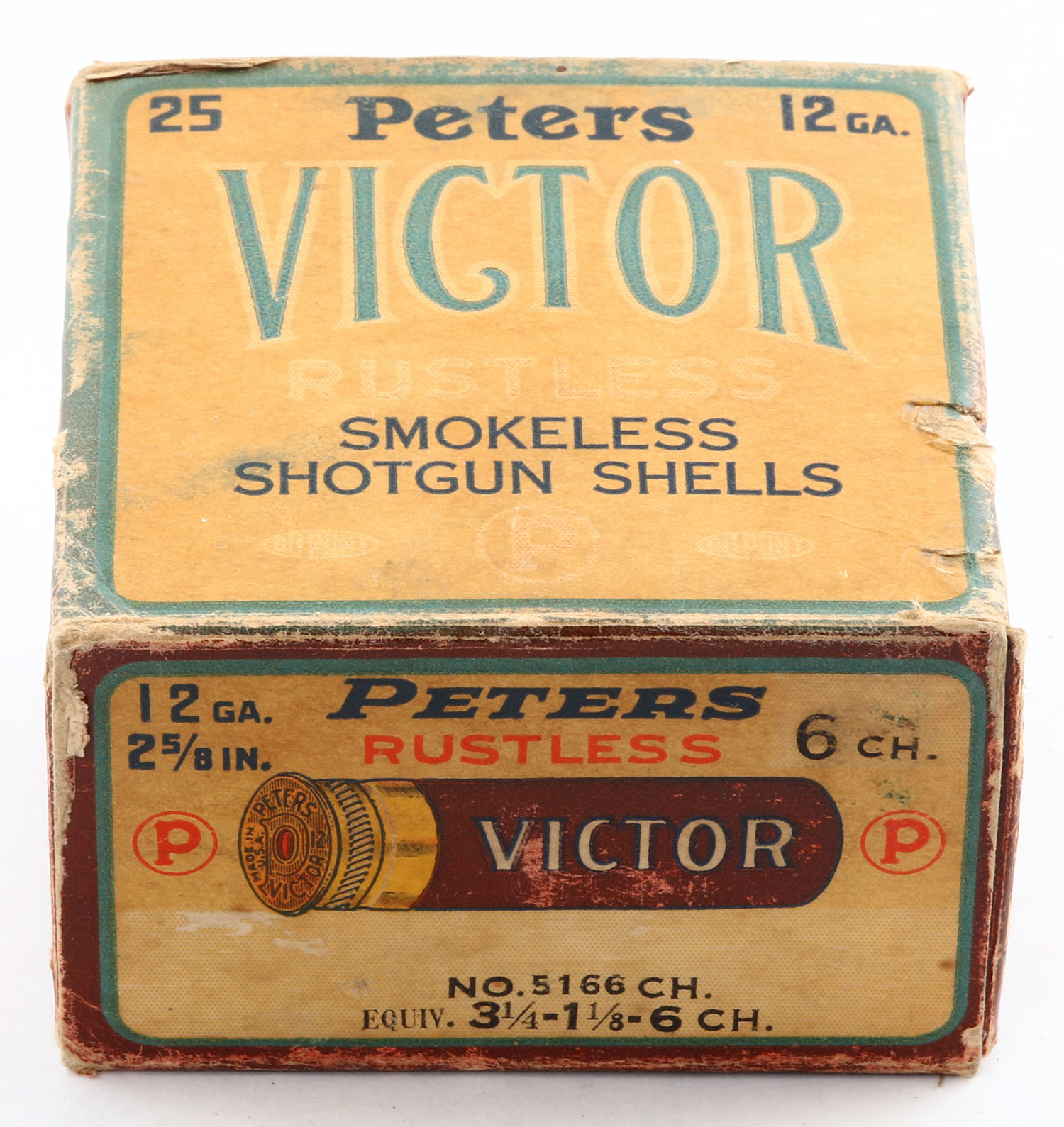 Peters, Victor, 12ga, 1pc., Full, shot size 6 Ch., Maroon, cream & orange box, 2 5/8'', box has edge wear & age soiling, paper shells are minty. Grade: Very Good + - Value: 20 to 60