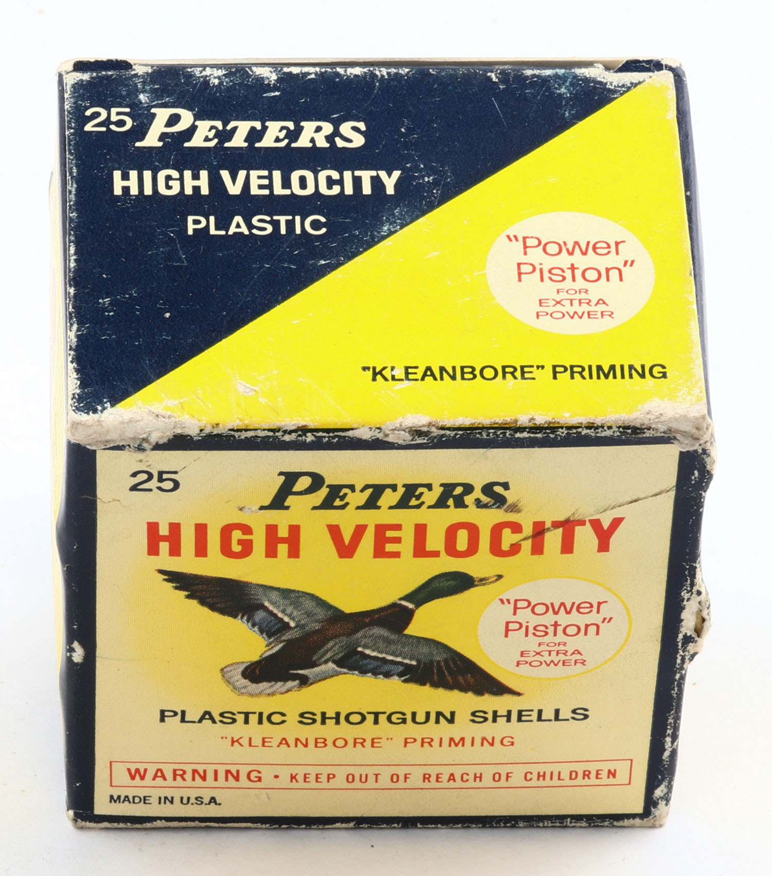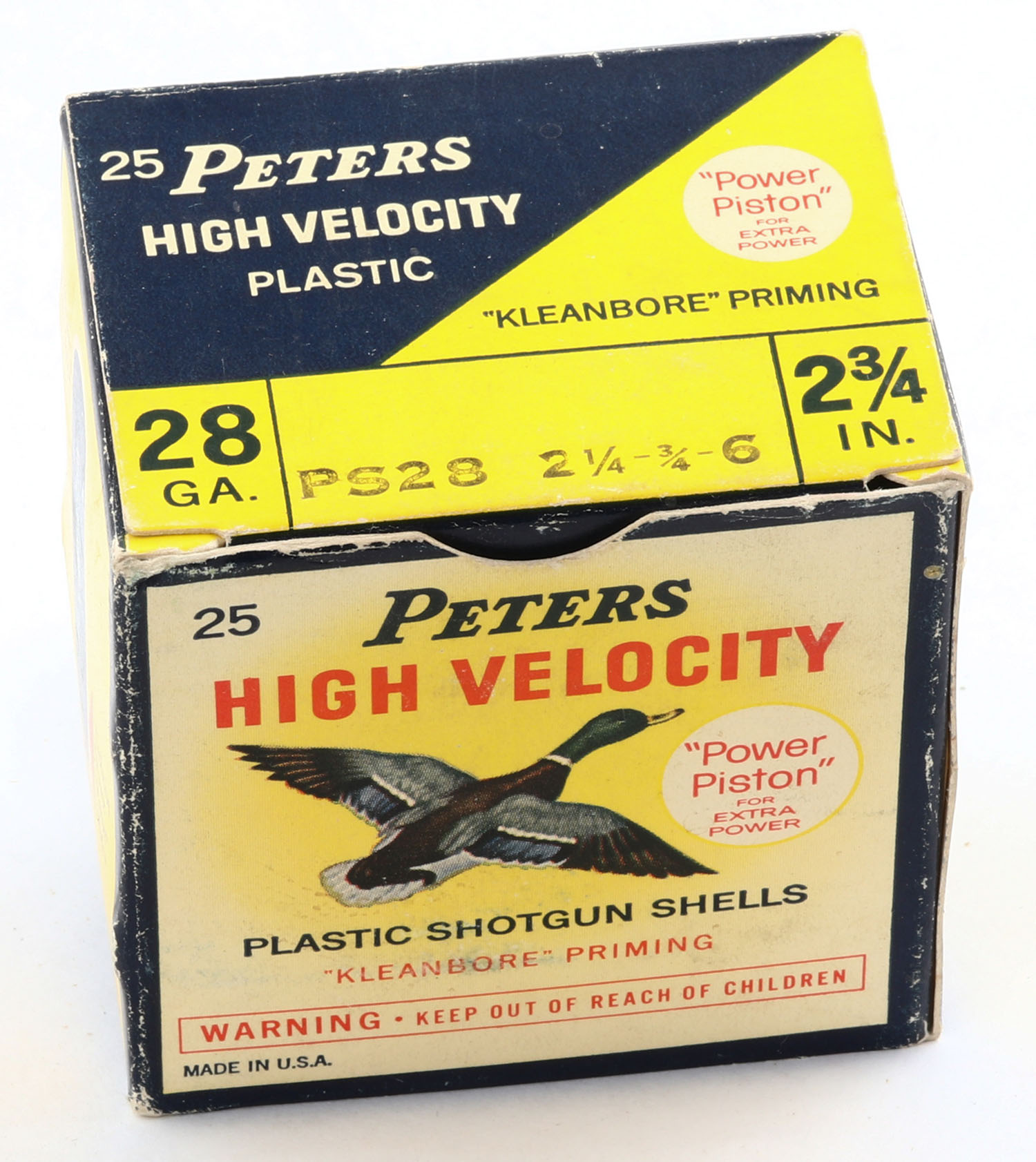 Peters Cart. Co., High Velocity, 28ga, 2 3/4'', 1pc., Full, shot size 6, multi colored box that pictures mallard flying, box has edge wear with excellent colors, plastic shells are excellent. Grade: Very Good ++ - Value: 10 to 30