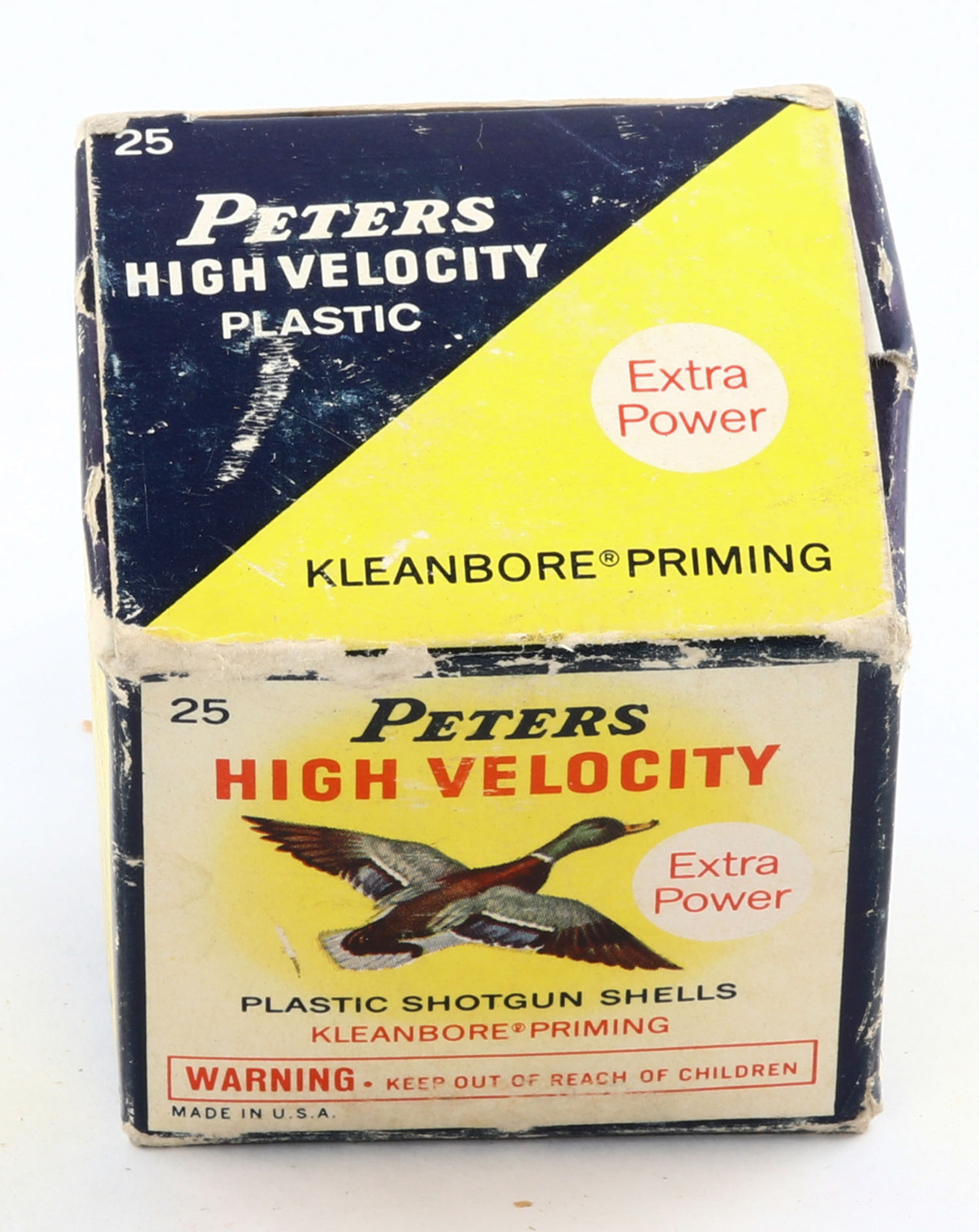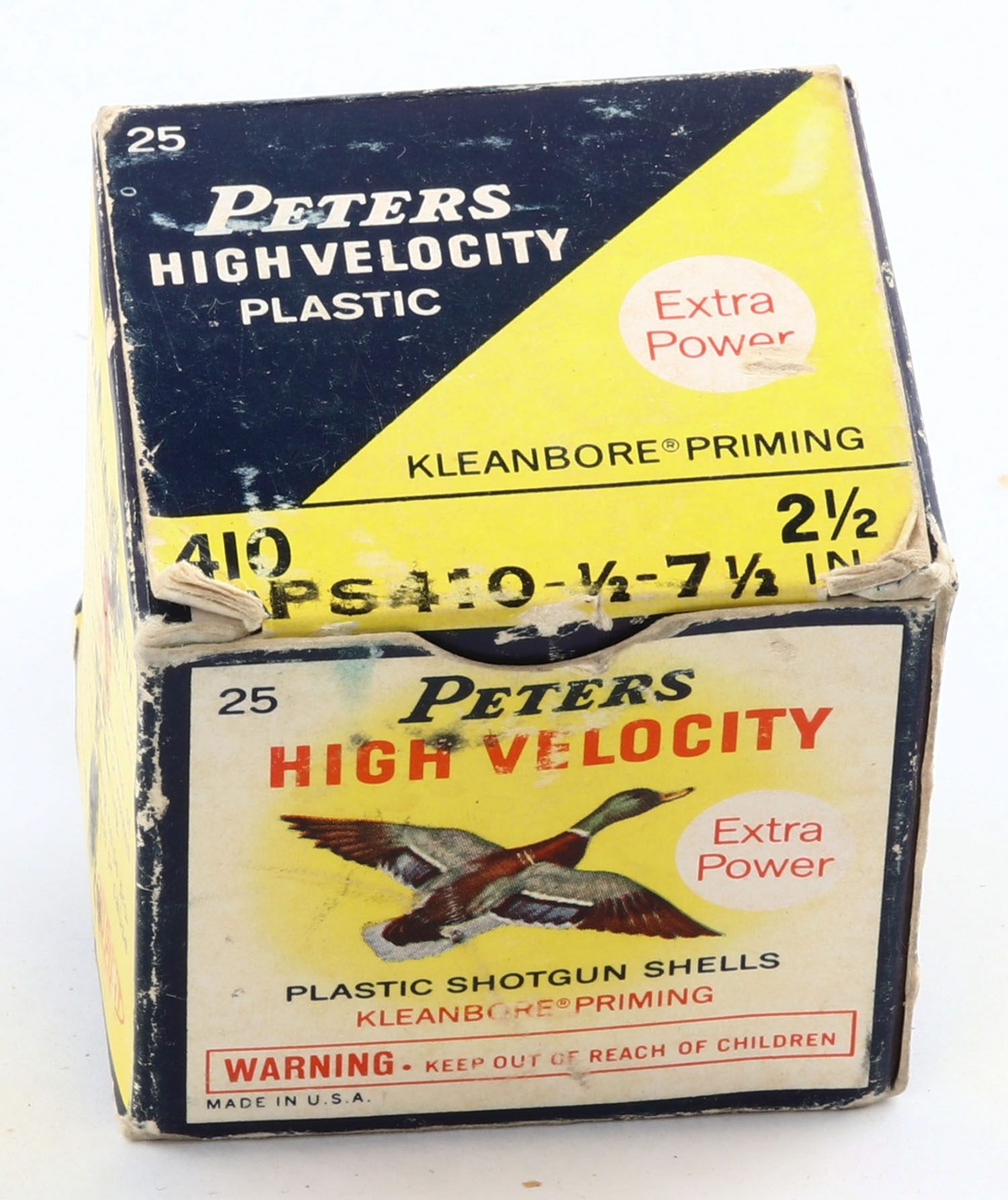 Peters Cart. Co., High Velocity, 410ga, 2 1/2'', 1pc., Full, shot size 7 1/2, multi colored box that pictures mallard flying, box has edge wear & scuffing, plastic shells are excellent. Grade: Very Good - Value: 10 to 40