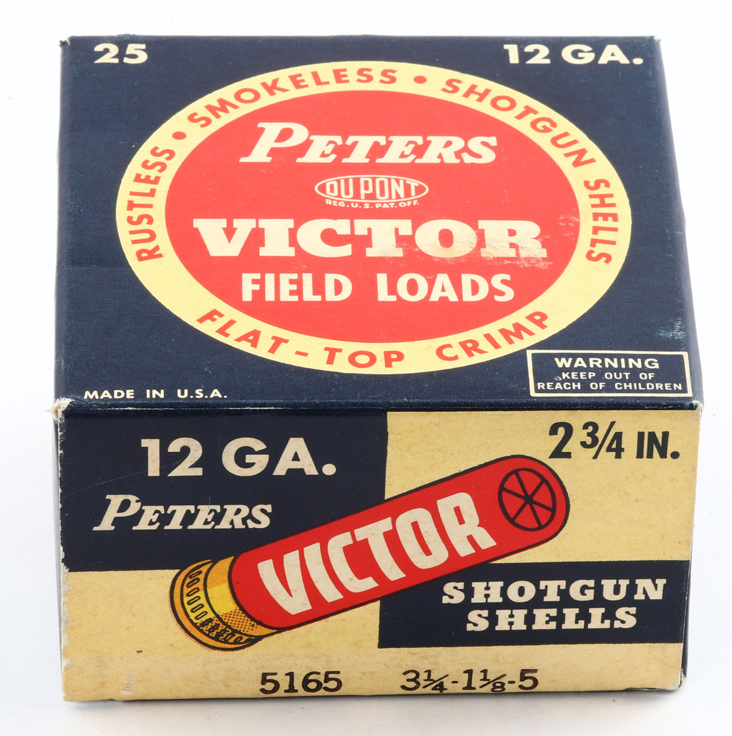 Peters, VICTOR Field Loads, 12ga., 1pc., Full, shot size 5, blue, yellow & red box, box is very solid with excellent colors, paper shells are excellent. Grade: Excellent ++ - Value: 20 to 60
