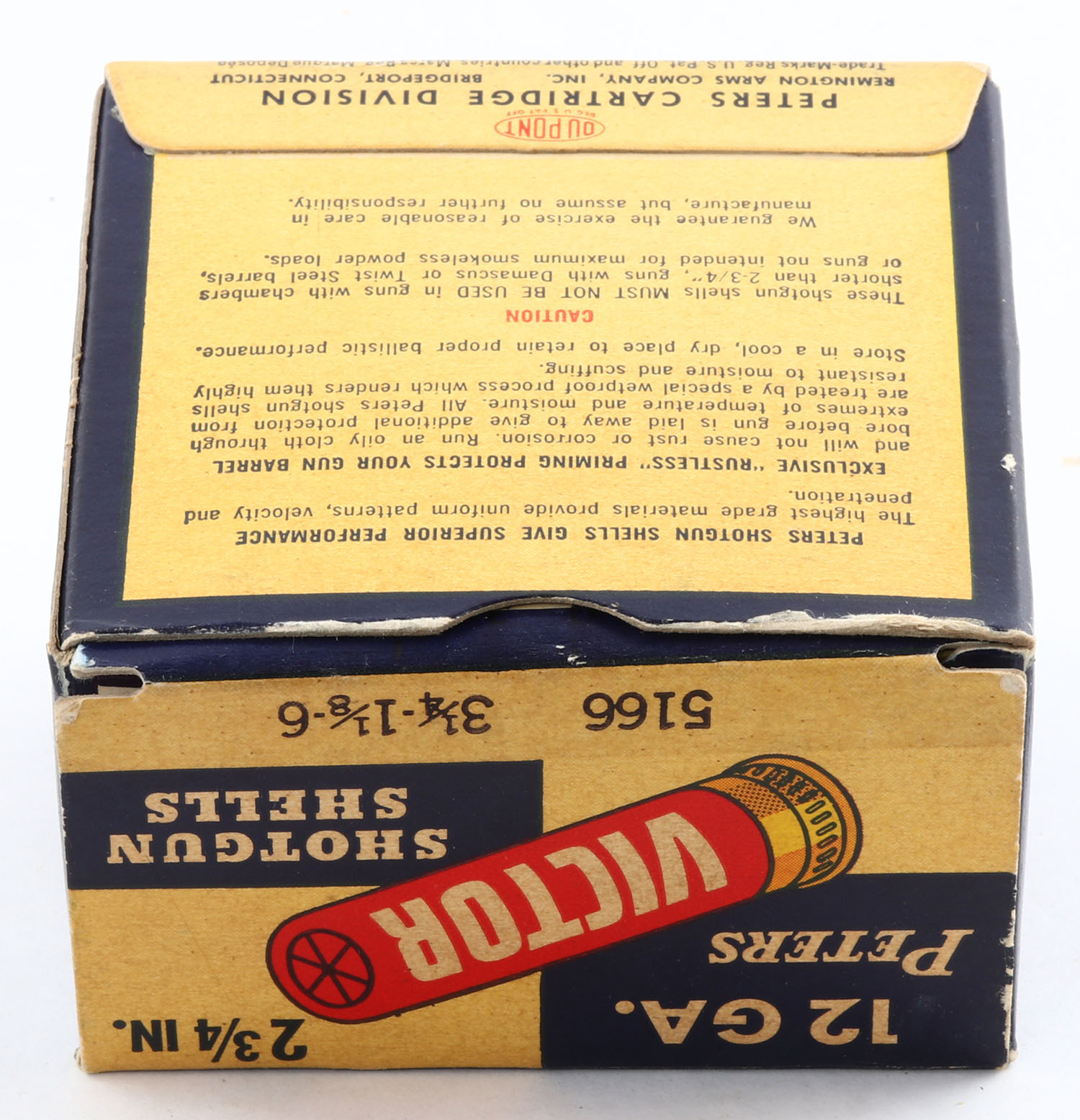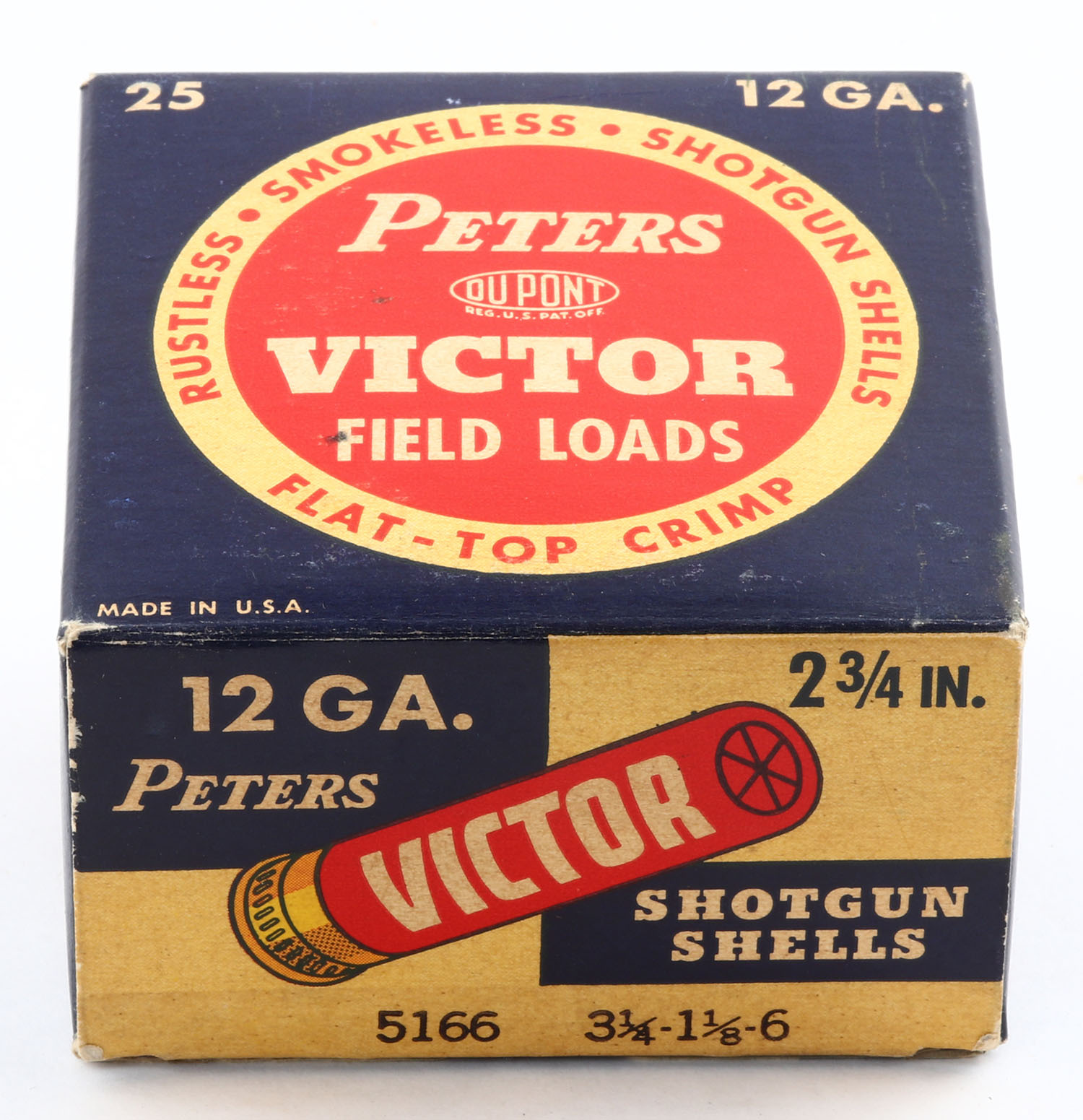 Peters, VICTOR Field Loads, 12ga., 1pc., Full with 14rds being correct shot, shot size 6, blue, yellow & red box, box is very solid with excellent colors, paper shells are excellent. Grade: Excellent - Value: 20 to 60