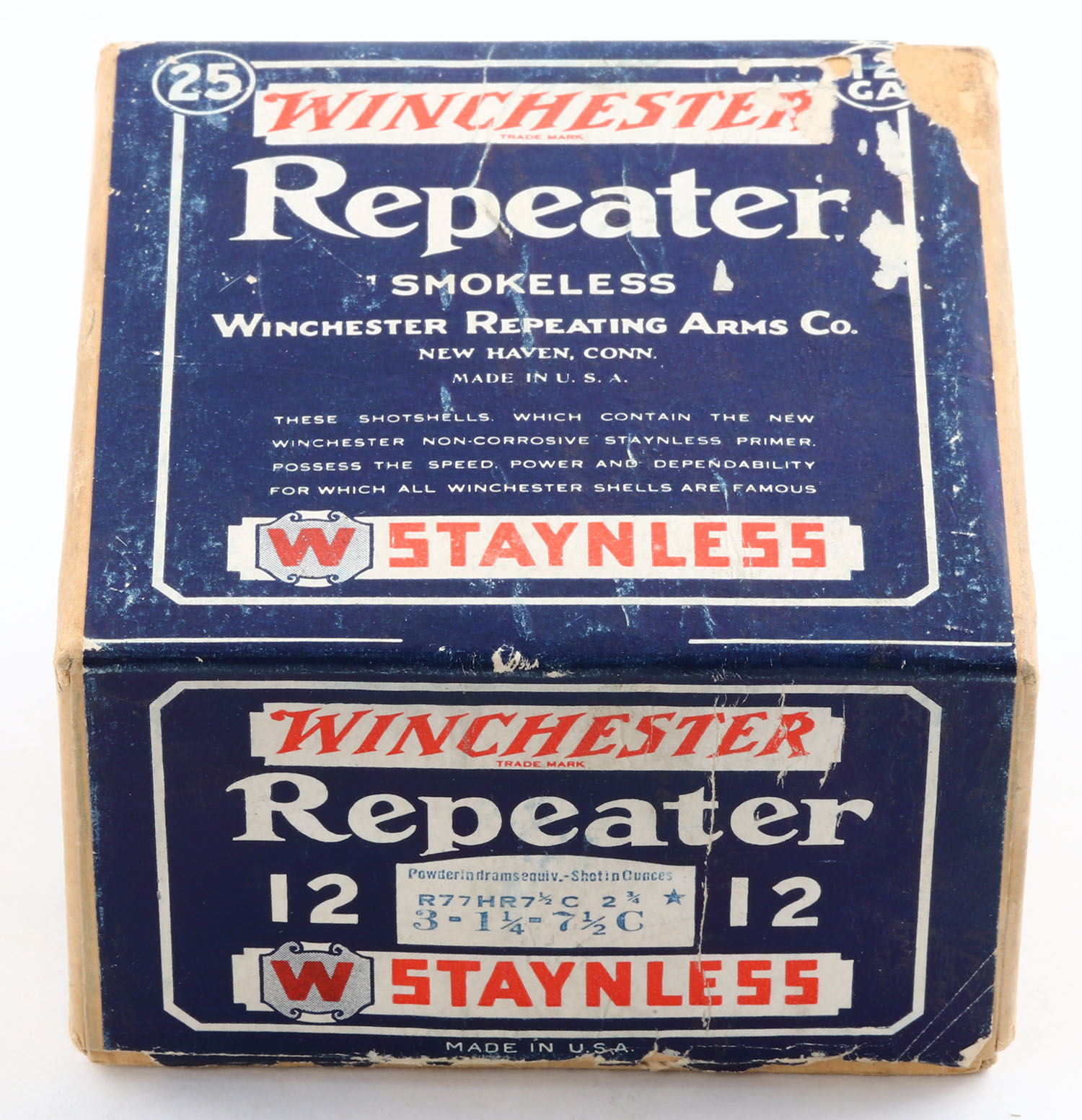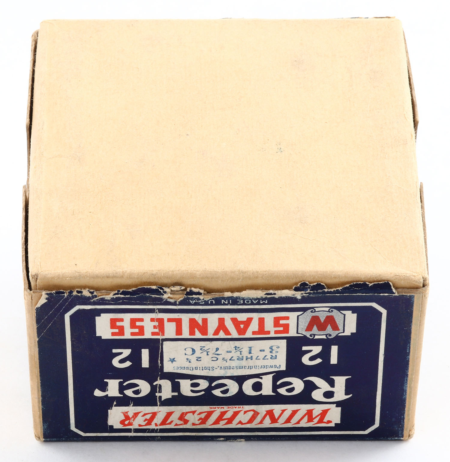 Winchester, Repeater, STAYNLESS, 12ga., 2pc., Empty., shot size 7 1/2 CH, buff box with blue, red & white label, box has no label to bottom, box has scuffing with light edge wear. Grade: Very Good + - Value: 40 to 80