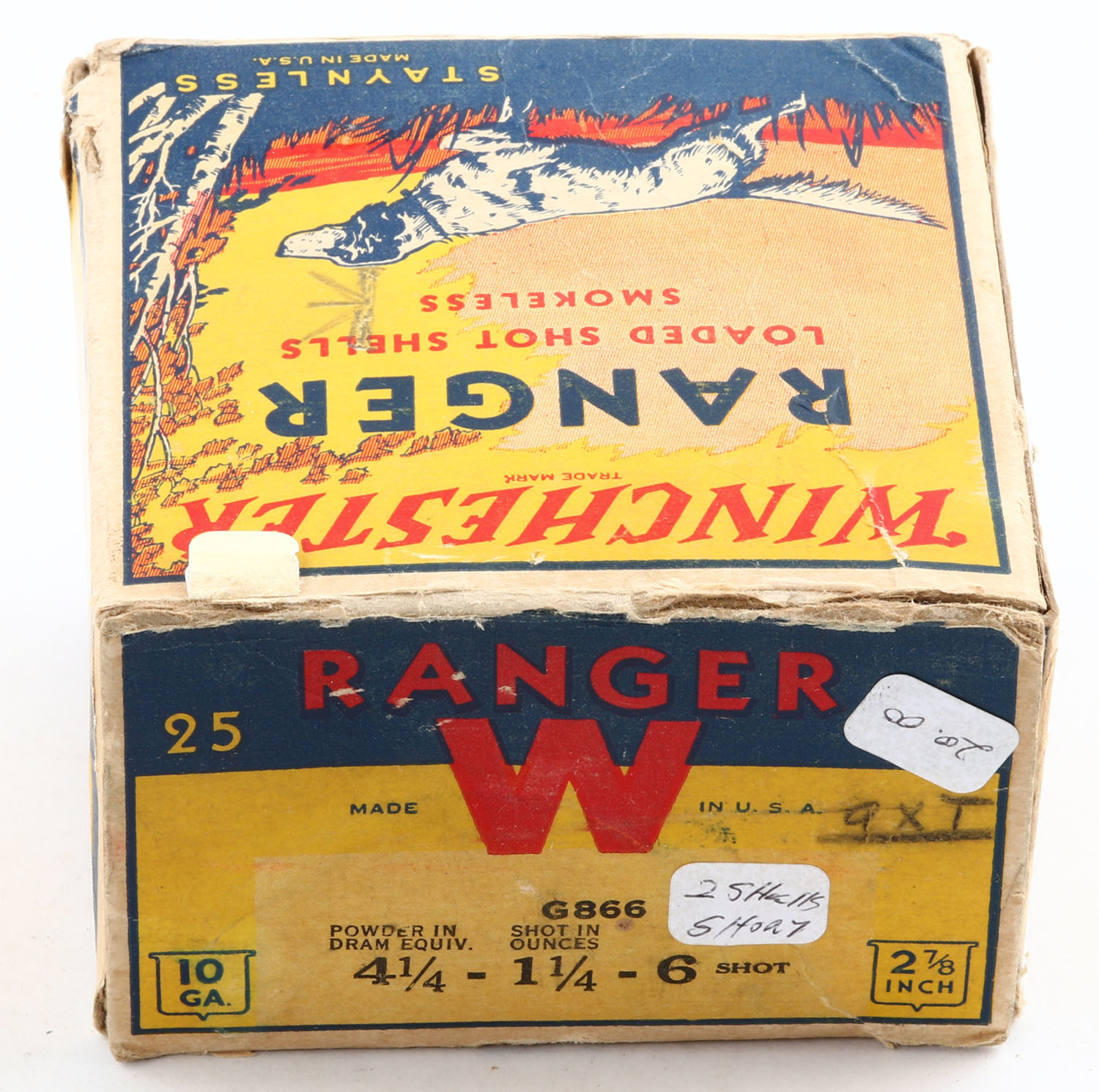 Winchester, Ranger, 10ga, 1pc., Partial 22rds, Shot Size 6, 2 7/8'', multi colored box, dog on point, box has edge wear with a partial seam split, has scuffing with very nice colors, paper shells are excellent. Grade: Very Good + - Value: 30 to 90