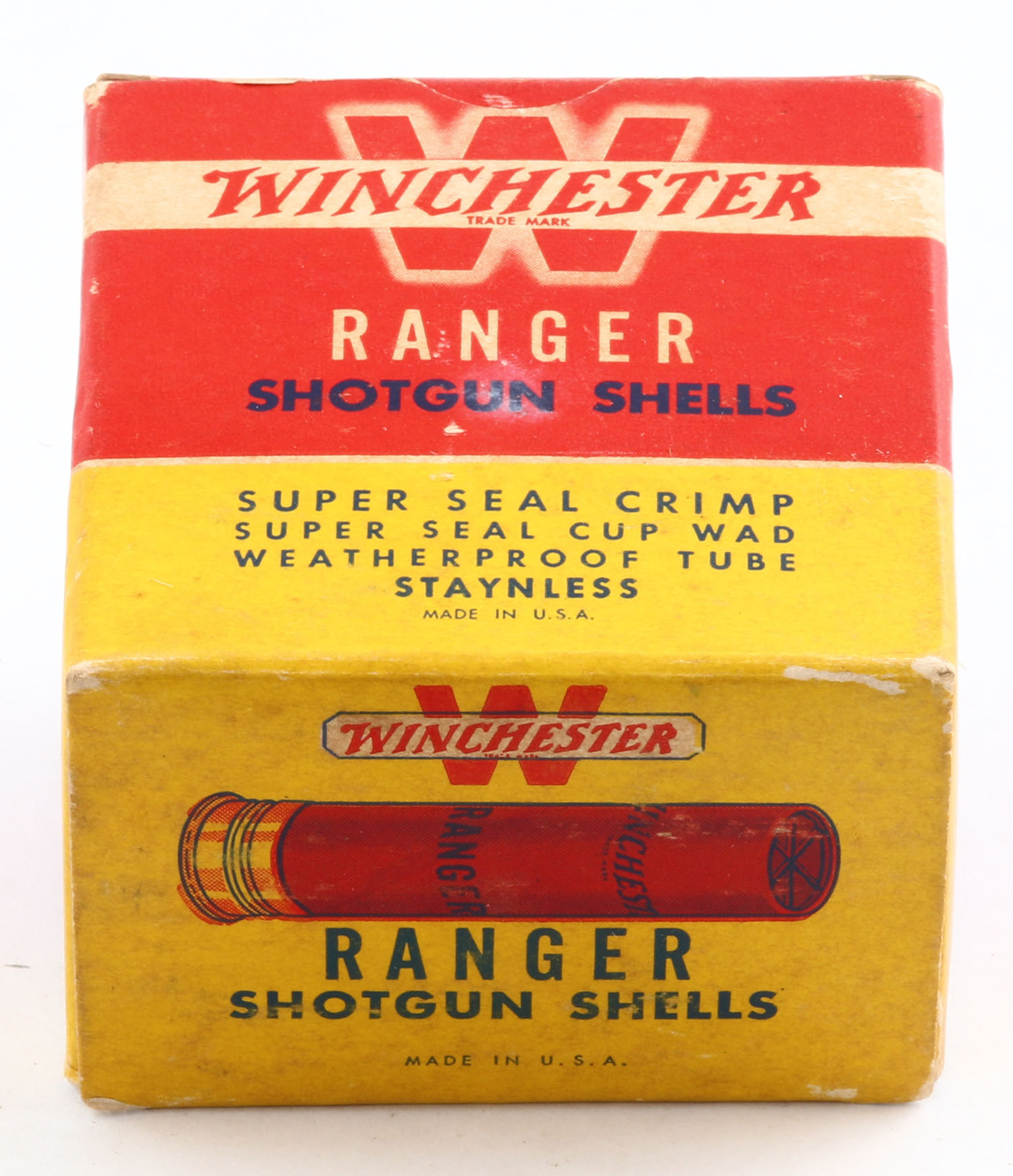 Winchester, Ranger, 20ga, 2 3/4'', Full, shot size 8, Red, white & yellow box, box has very minor age soiling, paper shells are excellent. Grade: Very Good ++ - Value: 10 to 40