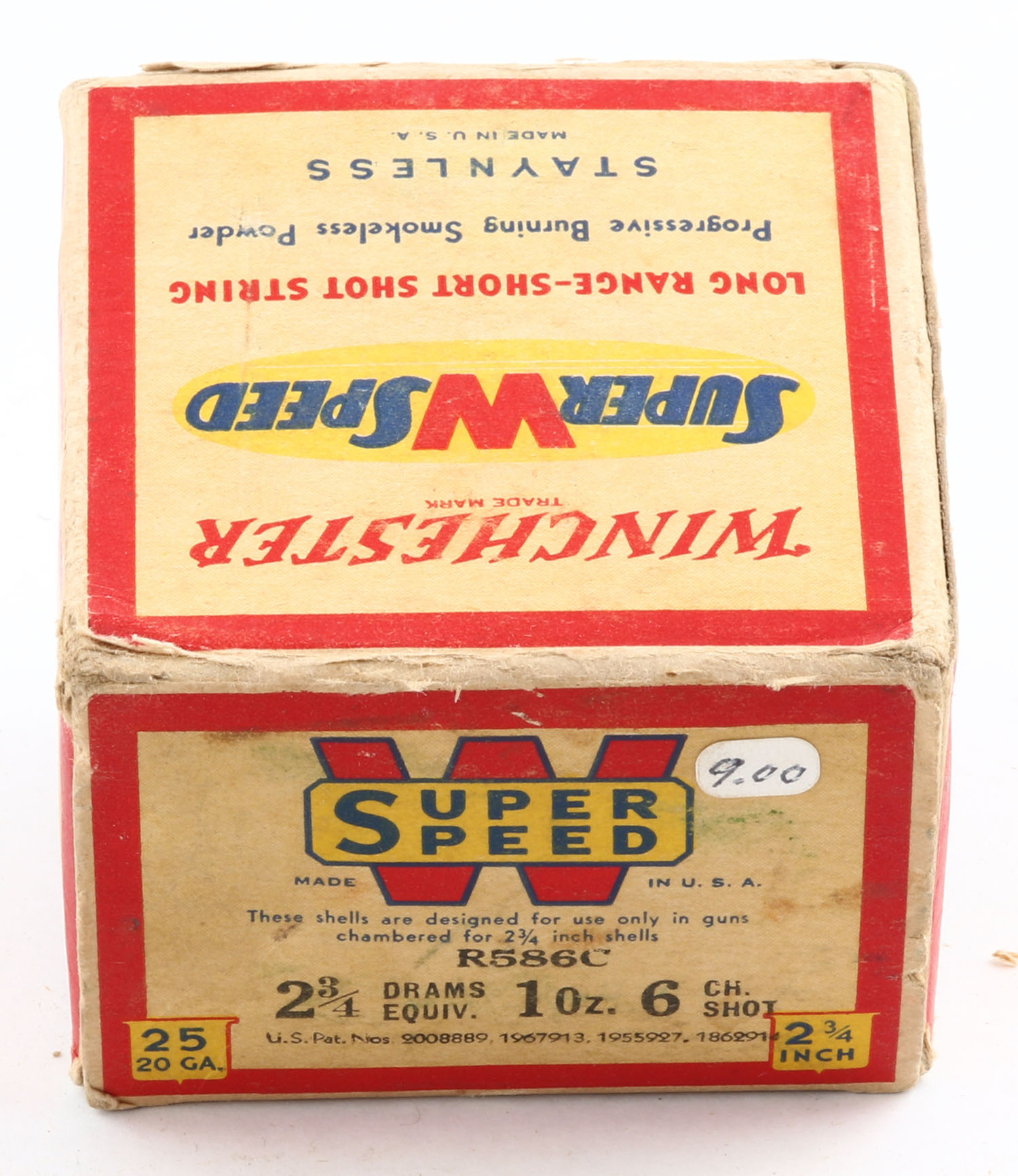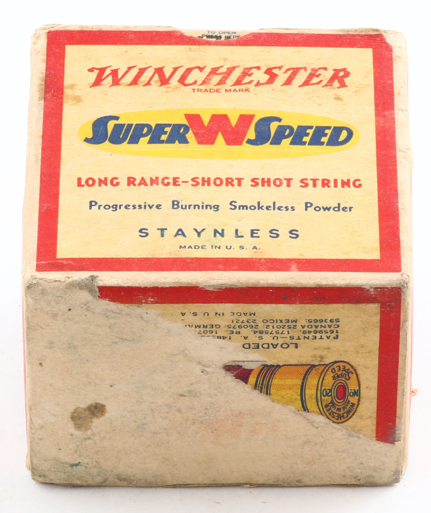 Winchester, Super W Speed, Staynless, 20ga., 2 3/4'', 1pc., Full, shot size 6 CH, cream, red, blue and yellow box, box has light scuffing with edge wear, paper shells are excellent. Grade: Very Good ++ - Value: 16 to 40