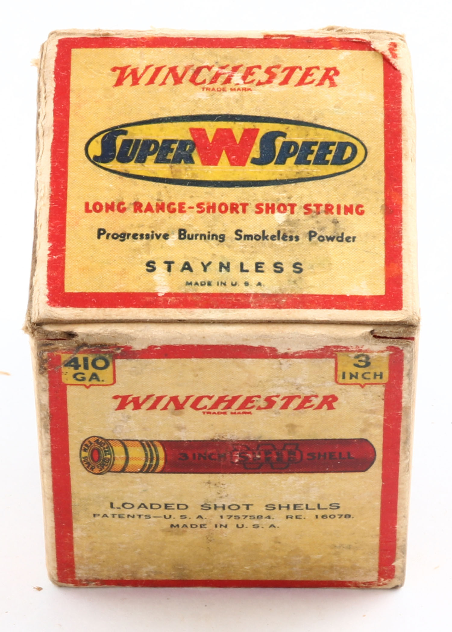 Winchester, Super W Speed, 410ga., Staynless, 3'', 1pc., Full, shot size 6CH, cream, red, blue and yellow box, box has age soiling & edge wear, paper shells are excellent. Grade: Very Good + - Value: 20 to 60