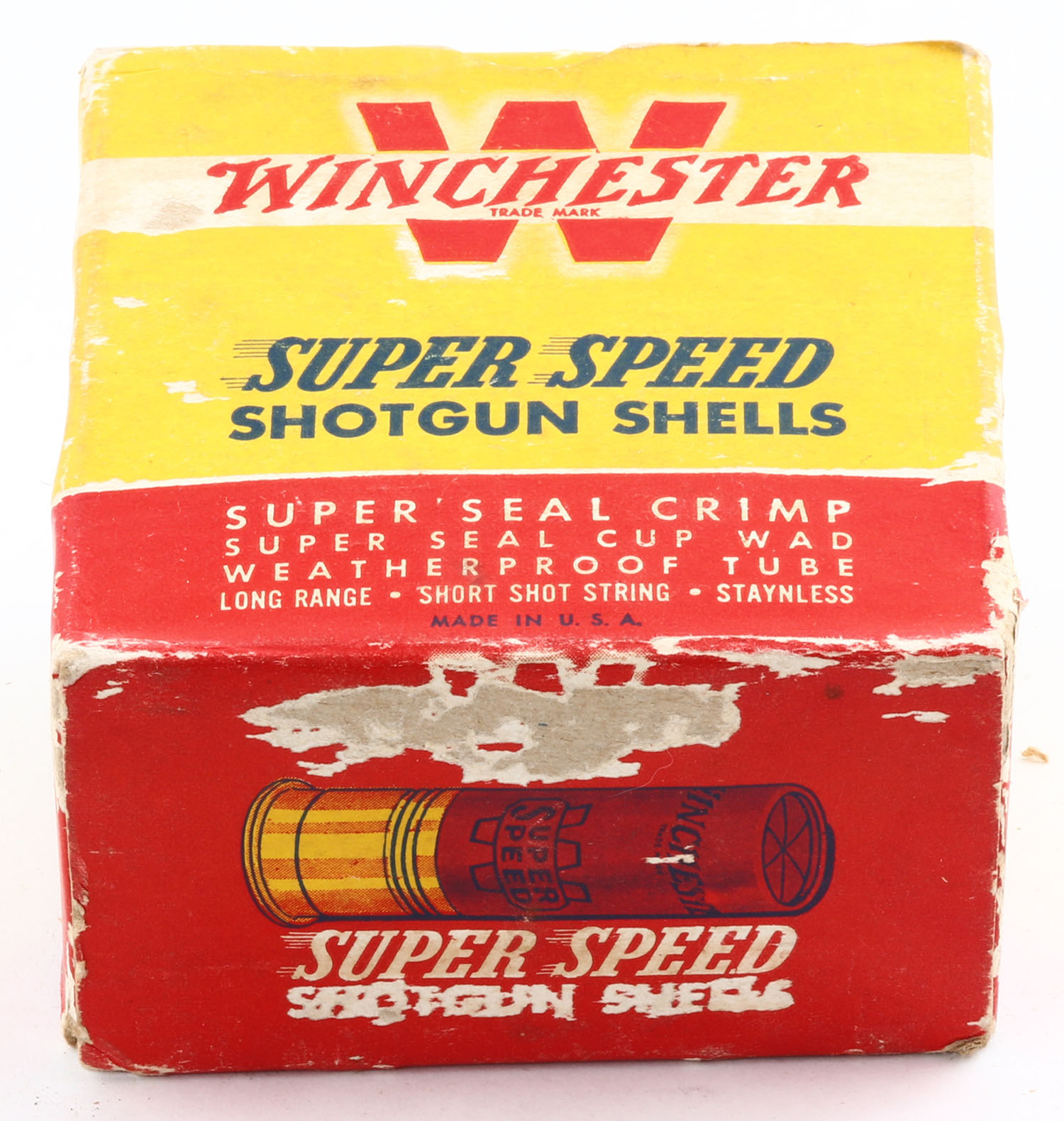 Winchester, Super Speed with Insert, 12ga., 2 3/4'', 1pc., Full, shot size 4 Magnum, red, black and yellow box, box has edge wear with scuffing, paper shells are excellent. Grade: Very Good ++ - Value: 10 to 40