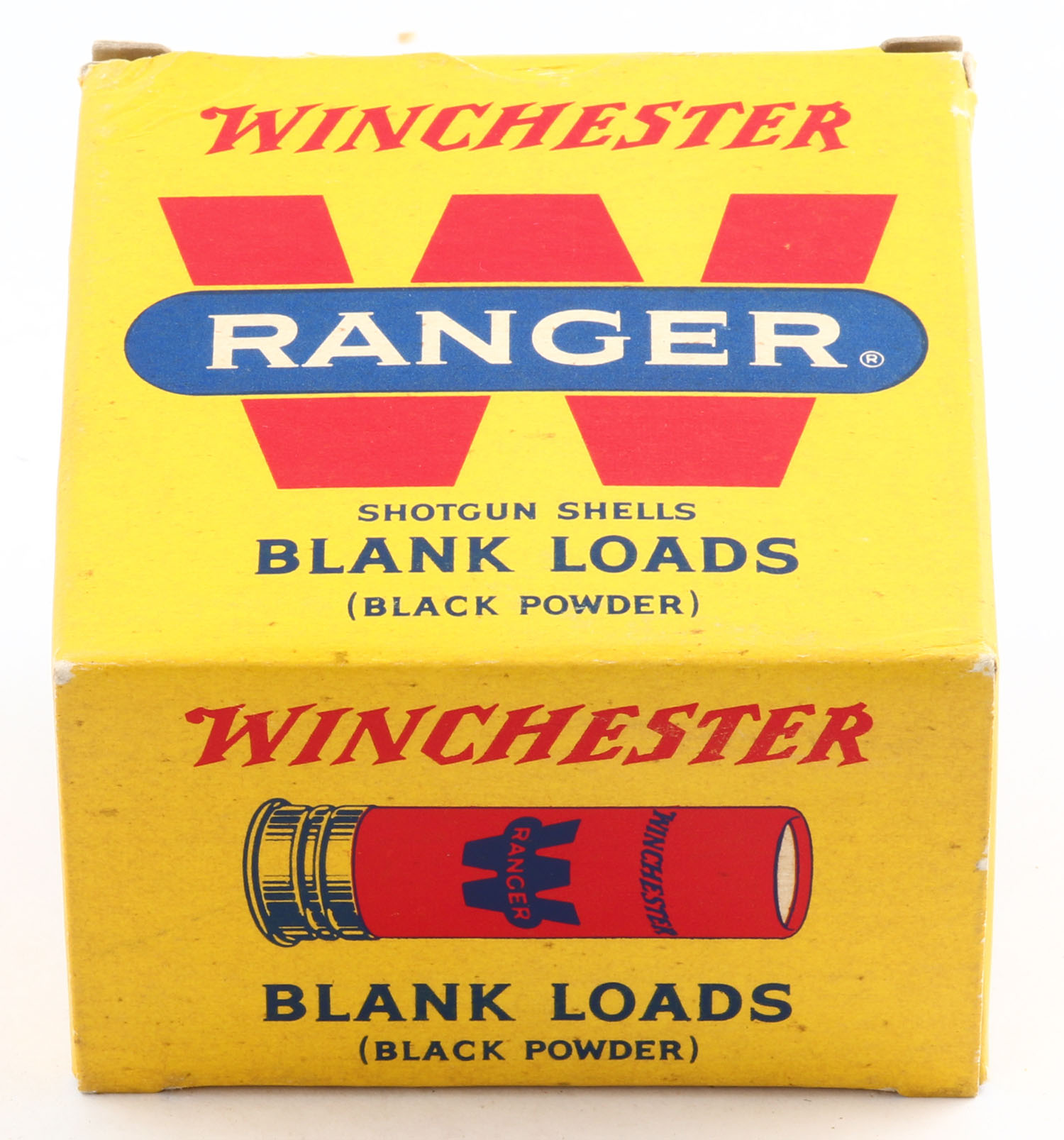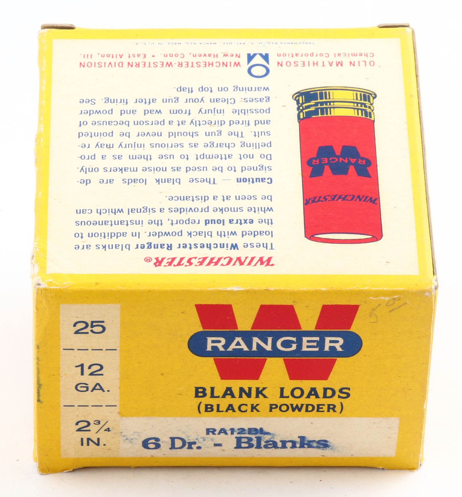 Winchester, Ranger, Blank Loads (black powder), 12ga, 1pc., Full, 2 3/4'', Yellow, blue & red box, box is very solid with excellent colors, paper shells are excellent. Grade: Excellent ++ - Value: 20 to 60