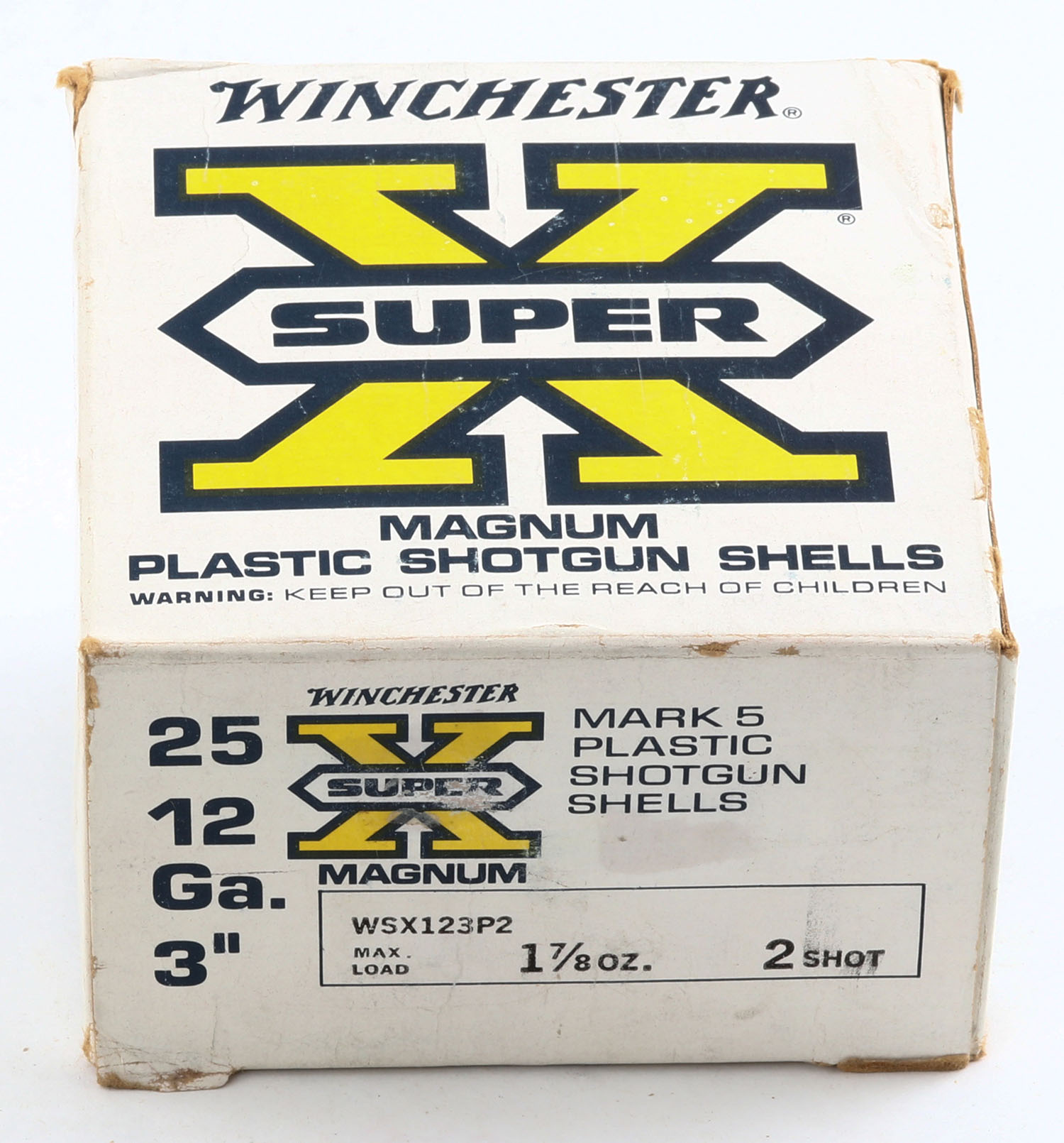 Winchester, Super X, Magnum, 12ga., 1pc., Full, shot size 2, yellow, blue and white box, box has edge & corner wear with great colors, plastic shells are excellent. Grade: Very Good ++ - Value: 10 to 40