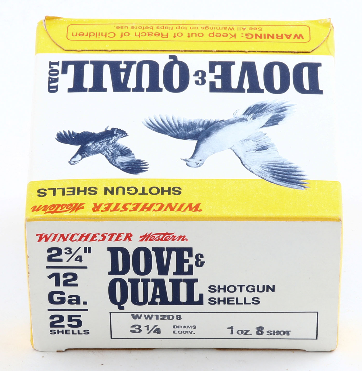 Winchester-Western, Dove & Quail, 12ga, 1pc., Full, multi-colored box, shot size 8, box is very solid with excellent colors, plastic shells are excellent. Grade: MINT - Value: 10 to 30